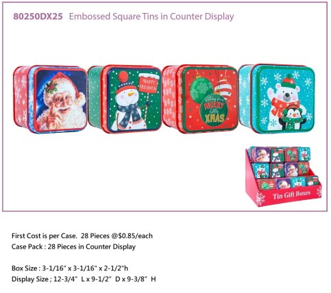Embossed Square Gift Card Tin - 4 styles:Santa head on blueSnowman on greenThree Ornaments on redSnowman and Penquin on light blueSpecifications