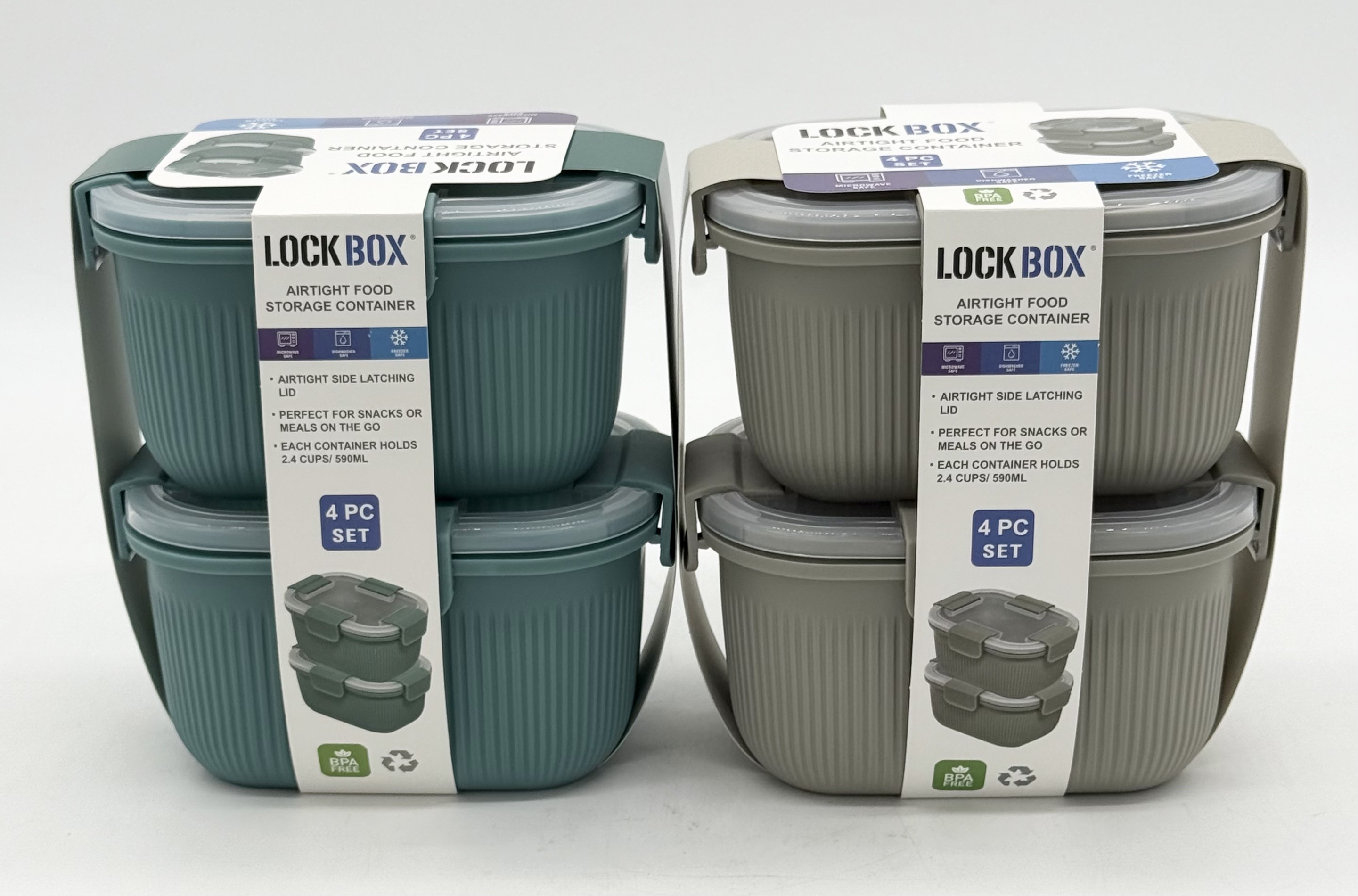 The Lockbox 4 pc (2 unit) side latching set features, latches on all four sides providing a secure airtight seal. Making this the perfect choice for taking food on the go. Also top rack dishwasher safe. Grey or Green.Specifications