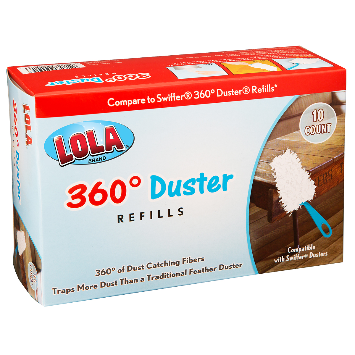 10 COUNT; ATTACH - CLEAN - TOSS; Has incredible magnetic-like dust Catching Fibers; Refills for the Lola 360 Duster Compatible and Comparable to Swiffer; Safe on wood tile electronic products and other hard surfaces; Traps more dust than a traditional feather duster