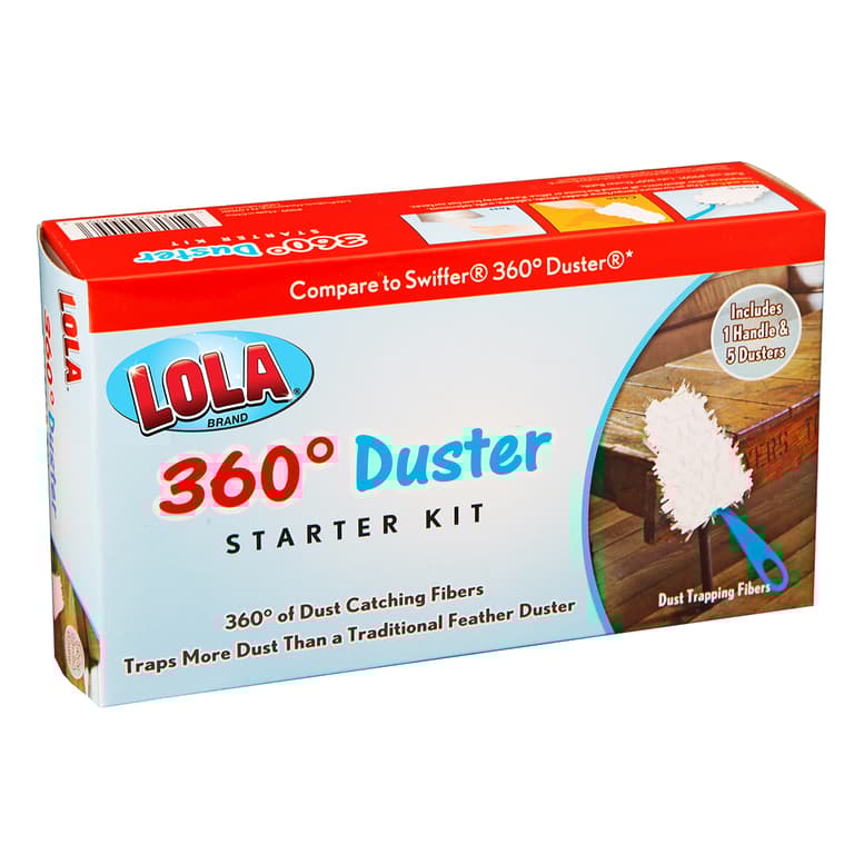 The Lola Duster Starter Kit is the right product for someone who takes cleaning and in particular dusting seriously and always wants to have the ability to change out heads without running out. It has over two thousand magnet-like fibers that attract dust like a vacuum. Dust adheres to Lola Brand Item# 909 much much more than a standard feather style dusting cleaning tool.Specifications