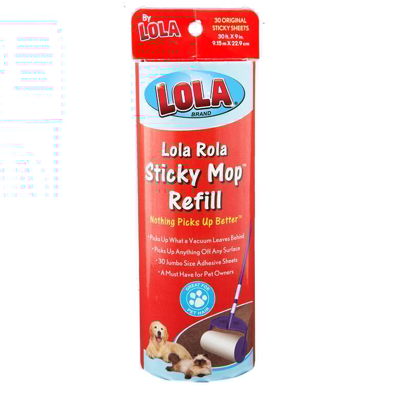 The Lola Rola 902 sticky mop will pick up hair lint and other particles from your clothing and furniture. The Lola Rola sticky mop refill package contains six 9-inch wide rollers. Each roller has 30 large sheets per roll.Specifications