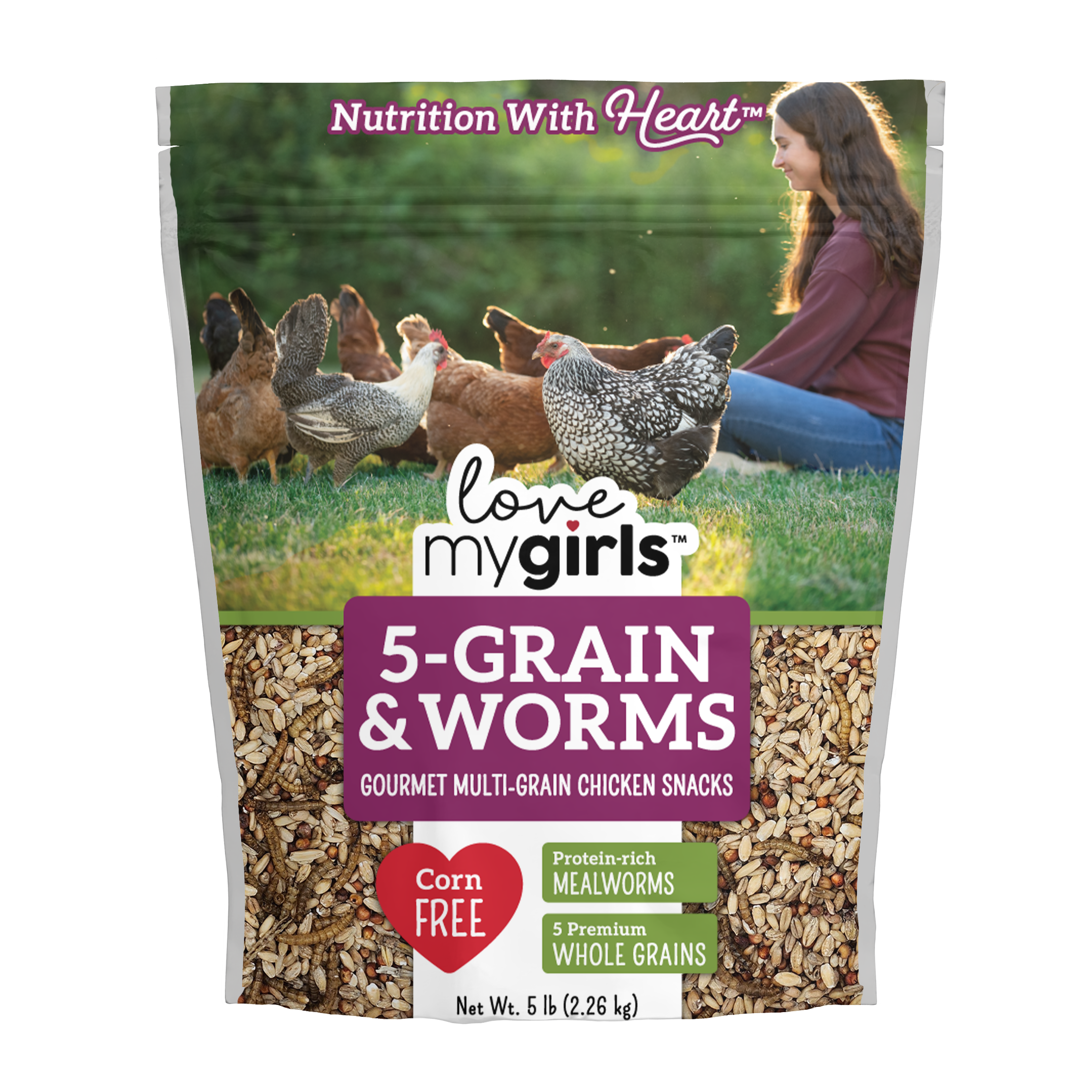5 lb Bag; 5 Premium Whole Grains; Corn Free Formula; Multi-Grain Chicken Snack; Protein-rich Mealworms