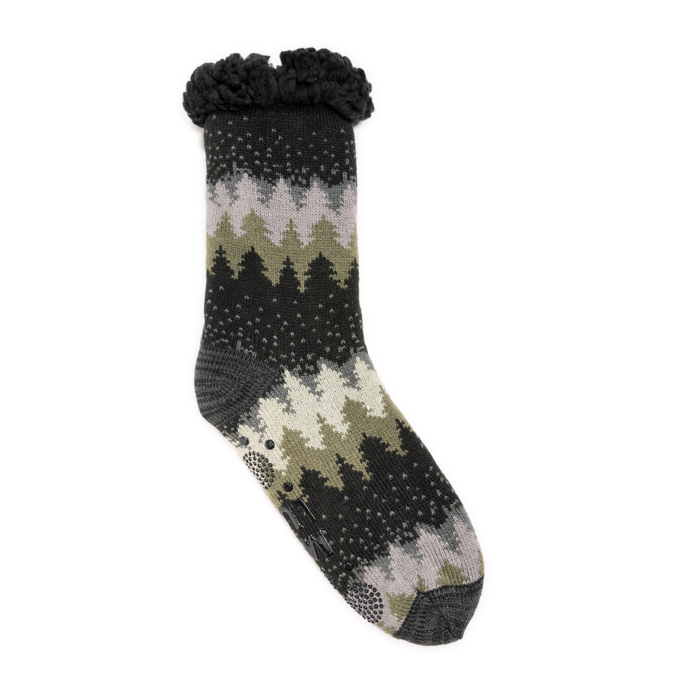 FAUX SHEARLING LINING; NONSKID BOTTOMS; TALL CABIN SOCK; WARM