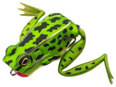 Creates a surface disturbance with its concave face that causes popping and spitting noises; Draws the attention of bass and pike; Sharp high-quality upturned hooks; Swimming legs give it a realistic frog appearance; Weedless design with a hollow body