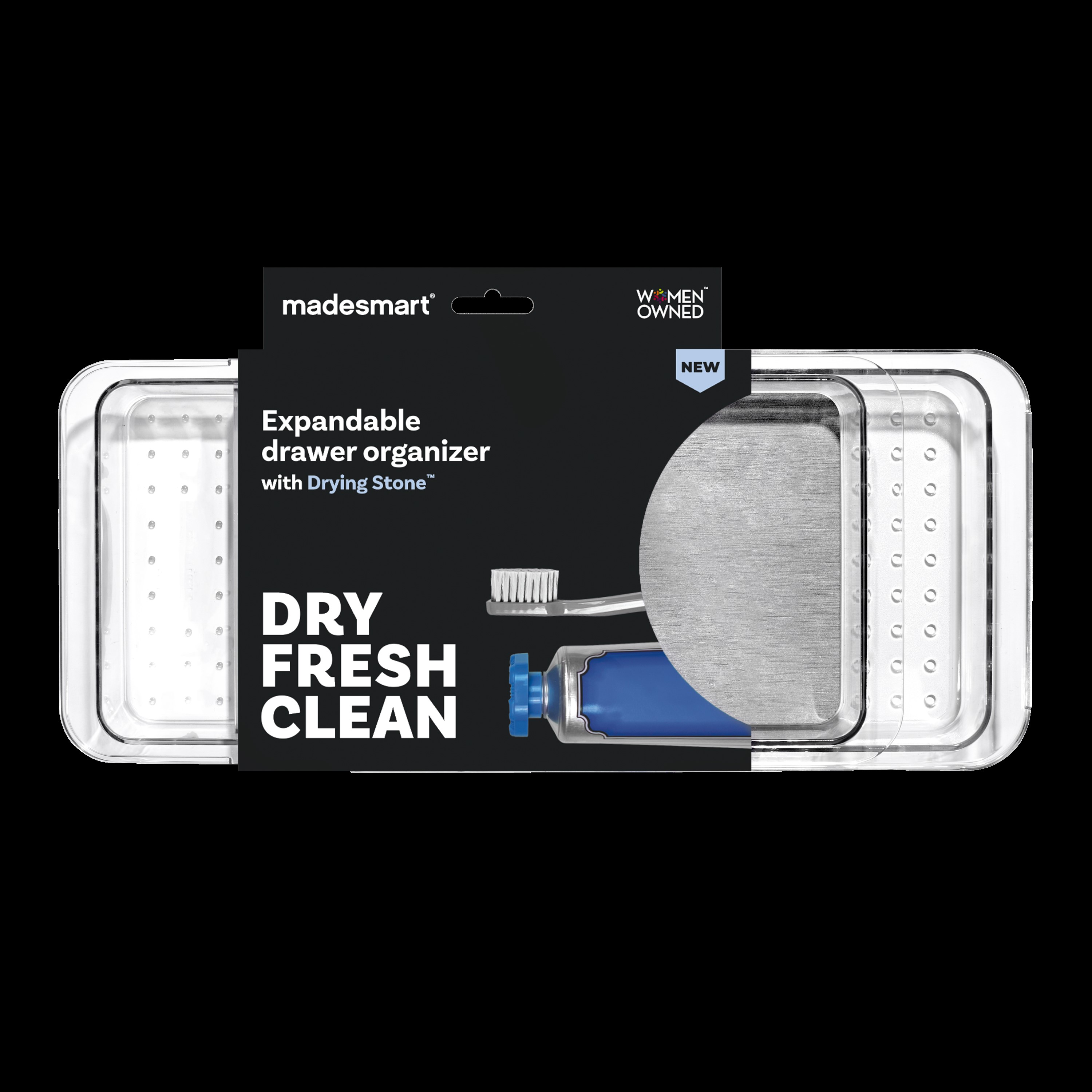 The madesmart Drying Stone Expandable Drawer Organizer features two compartments for a toothbrush and essentials. Made of high-quality plastic and mineral-based material, it dries fast, resists germs, and detaches for cleaning.Specifications