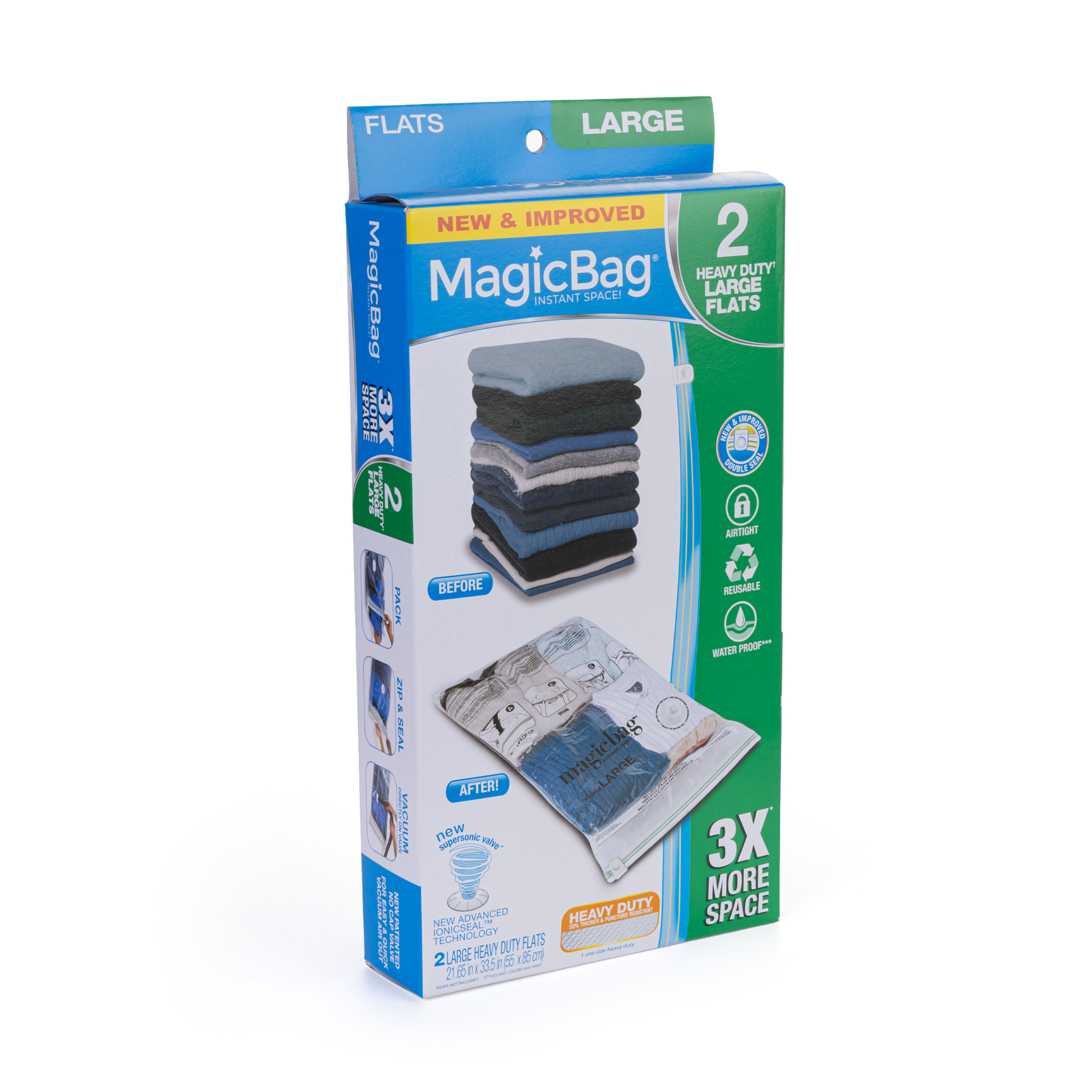 automatic, airtight one-way valve fits most vacuum hoses; Creates 3X more space; Dimensions: 21.65"W x 33.5"D; Each bag holds 2 bedding sets and 4 pillows; Lab tested and proven to stay airtight; Protects against dirt, odor, insects, and mildew; Reusable; Rounded double zipper; Smart Design 2-Pack Large MagicBag Vacuum Compression Bags; waterproof