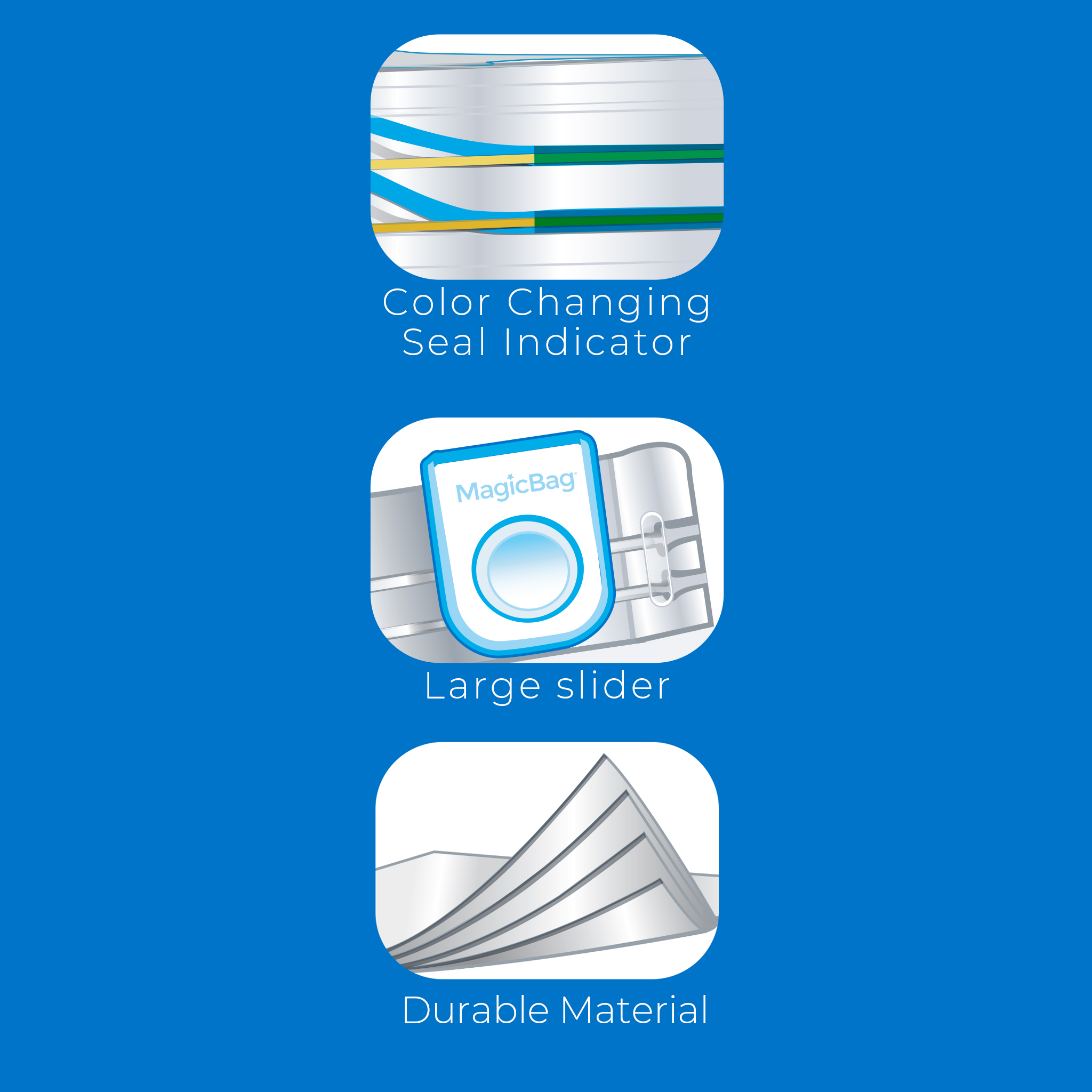 Airtight; Color changing seal indicator; Double seal; Durable material; Ideal for hotel rooms; Large Slider: molded grips and tighter grooves to secure slider from detaching and help create a stronger seal; Removable Plastic Hooks: hang bag like a hamper and pack with dirty clothes while traveling. When full, just remove hooks to compress, seal, and pack into luggage.; Reusable; Water proof