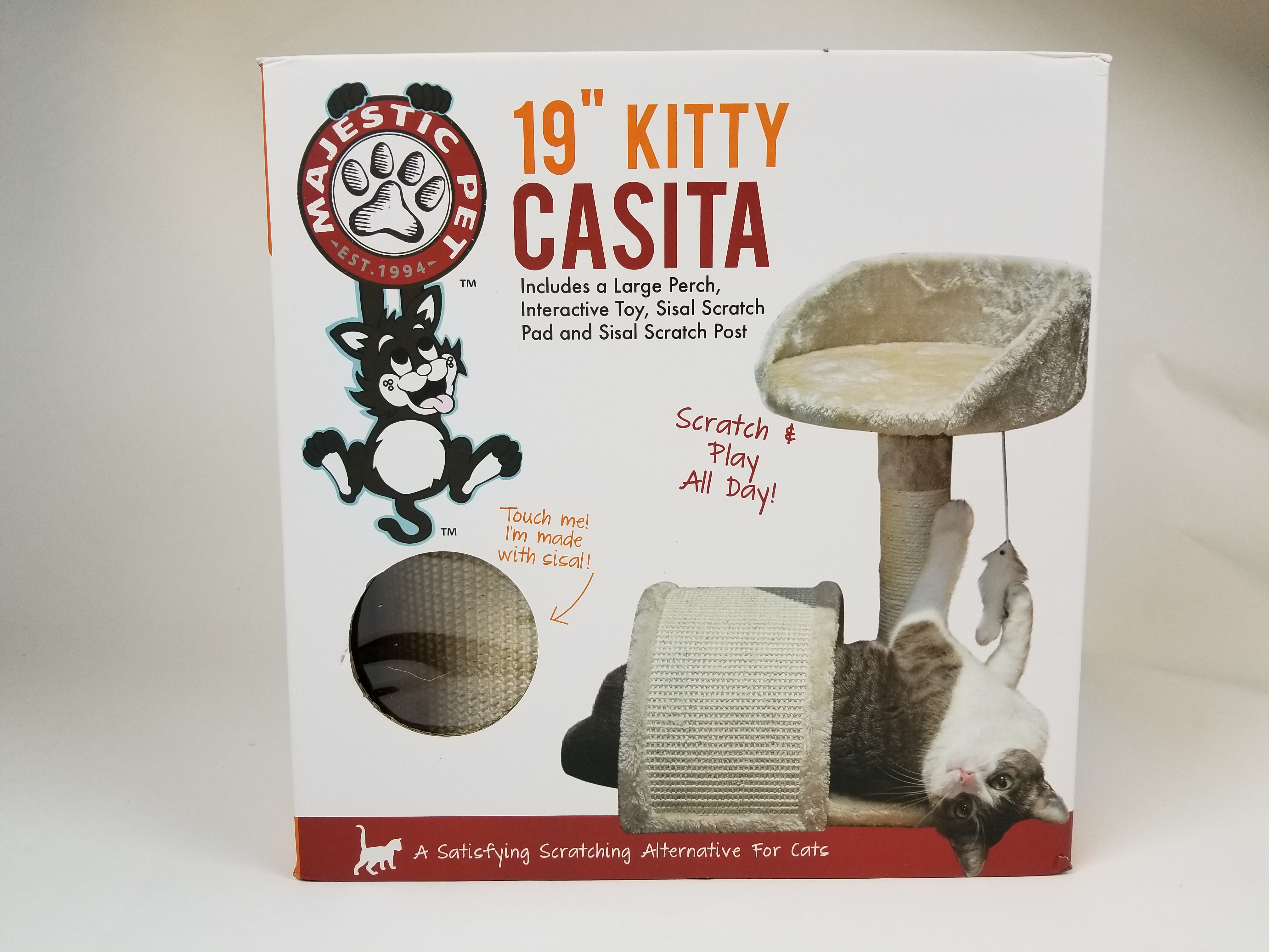 Majestic Pet Products 19 inches Casita Cat Tree is covered in elegant Honey / Grey Faux Fur or Sherpa with a Sisal Rope wrapped post that will withstand the toughest claws. Features a soft padded perch for lounging and a large sisal bridge for another scratching option.Specifications