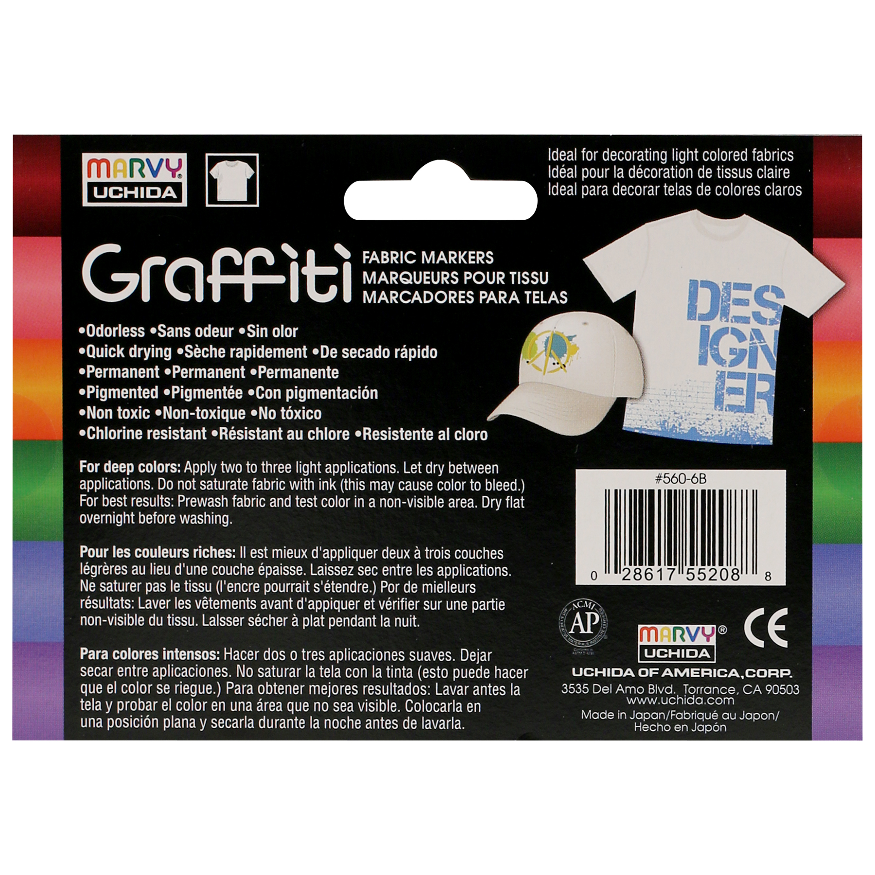 The Graffiti Fabric Markers are the ideal marker to use for light colored fabric. This fabric marker pen has a tapered medium tip allowing for a variety of thickness. Easily create costumes, personalized attire, and gifts with the Graffiti Fabric Markers. Odorless, quick drying, non-toxic. For deep colors: Apply two to three light applicators. Let dry between applications. Do not saturate fabric with ink (this may cuase the color to bleed).For best results: Prewash fabric and test color in a non-visible area. Dry flat overnight before washing.Specifications