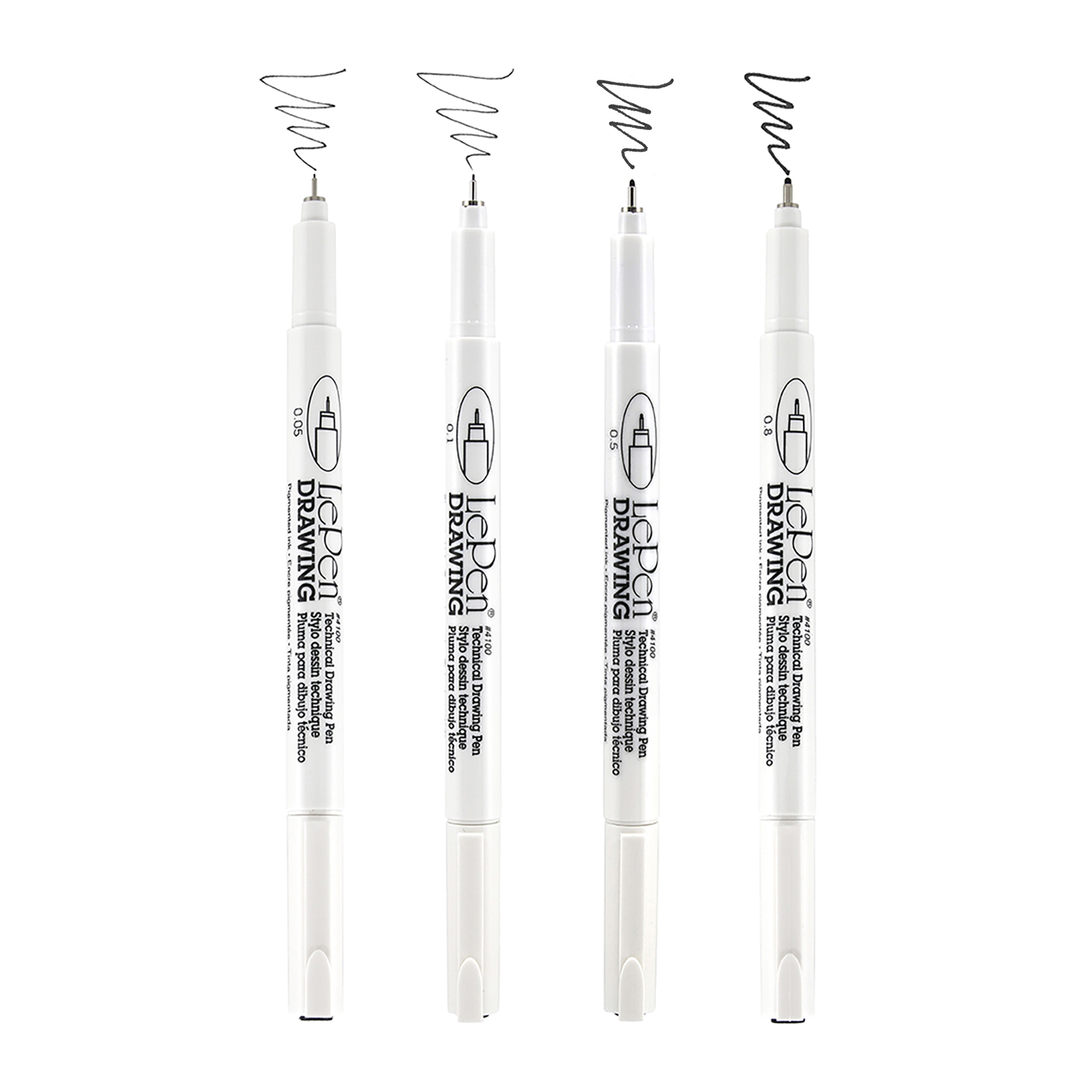 Uchida's Le Pen Drawing pen set works great with alcohol markers, won't bleed or blend together. Micro fiber fine tips and soft brush tip. Water based and prigmented ink. The ink is acid free, non toxic, lightfast and acrhival quality. Use on Manga zentable method and doodling. Package contains one 0.8mm tip pen, one 0.5mm tip pen, one 0.1mm tip pen and one .05mm tip pen. Made in Japan.Specifications