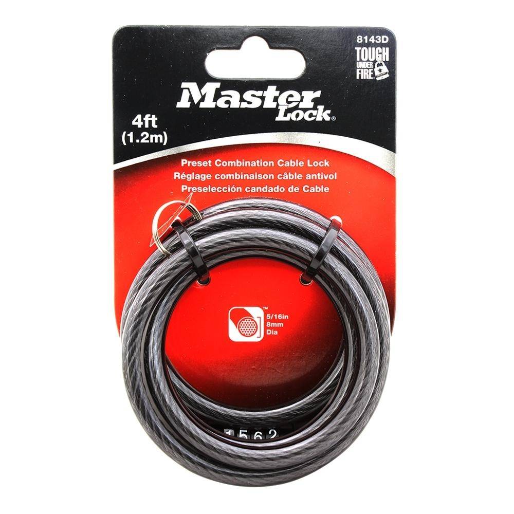 The Master Lock 8143D Preset Combination Cable Lock is 4ft 1.2m long and features a 5/16in 8mm diameter braided steel for maximum strength and flexibility. The protective vinyl coating protects against scratches. The 4 dial combination security offers keyless convenience. The Limited Lifetime Warranty provides peace of mind from a brand you can trust.Specifications