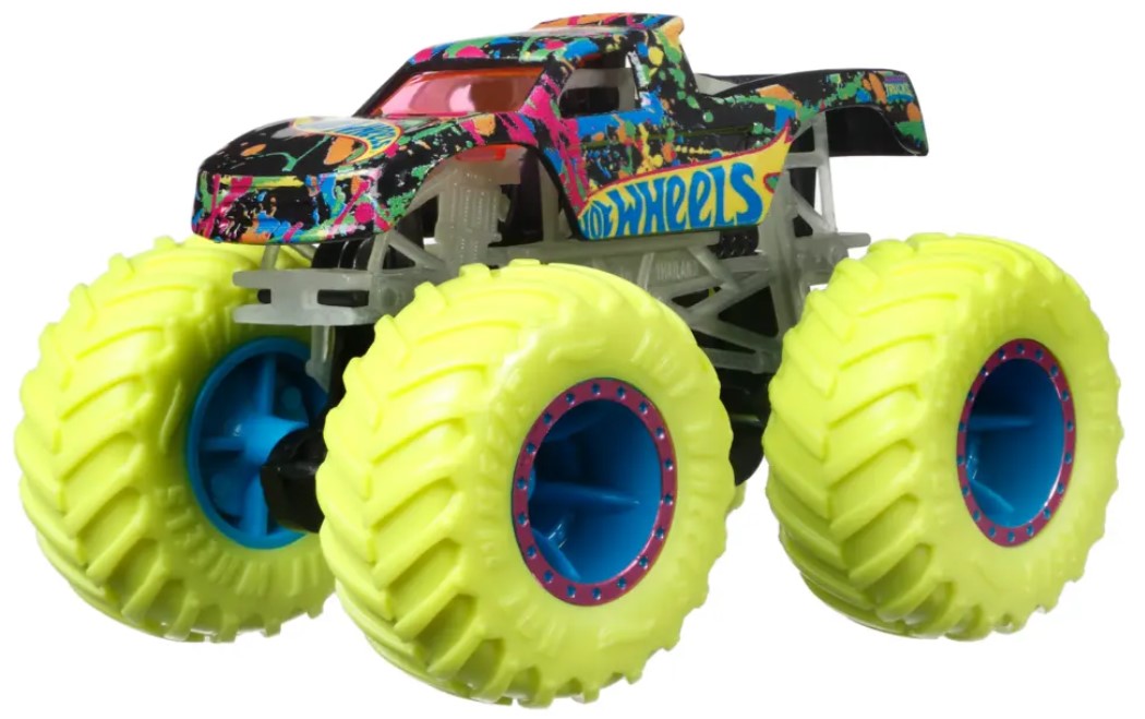 Each die-cast toy truck is 1:64 scale and features the big wheels and awesome designs that fans love.; each truck has a glow-in-the-dark feature; giant tires and fierce designs; It also has glow-in-the-dark elements that inspire visually exciting crashing and smashing