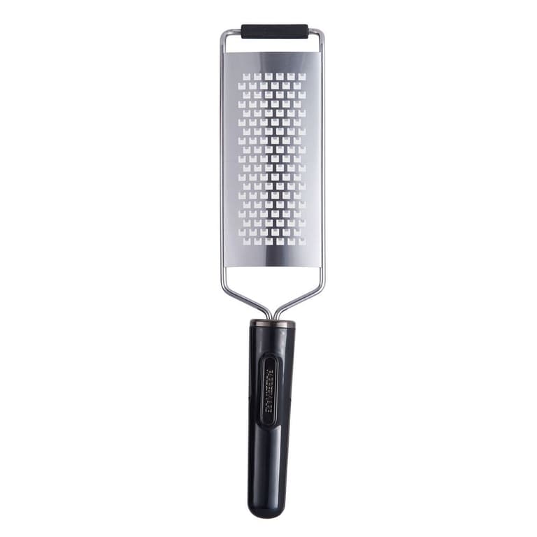 This Farberware Professional Black Medium Etched Hand Grater is perfectly sized for grating cheeses and chunks of hard chocolate. The ultra-sharp, etched stainless steel surface produces maximum results and the soft-grip footing ensures ease of grating with minimal effort. Includes a blade cover for protection when not in use. Measures 12-1/2 inches long. Dishwasher safe. .Specifications