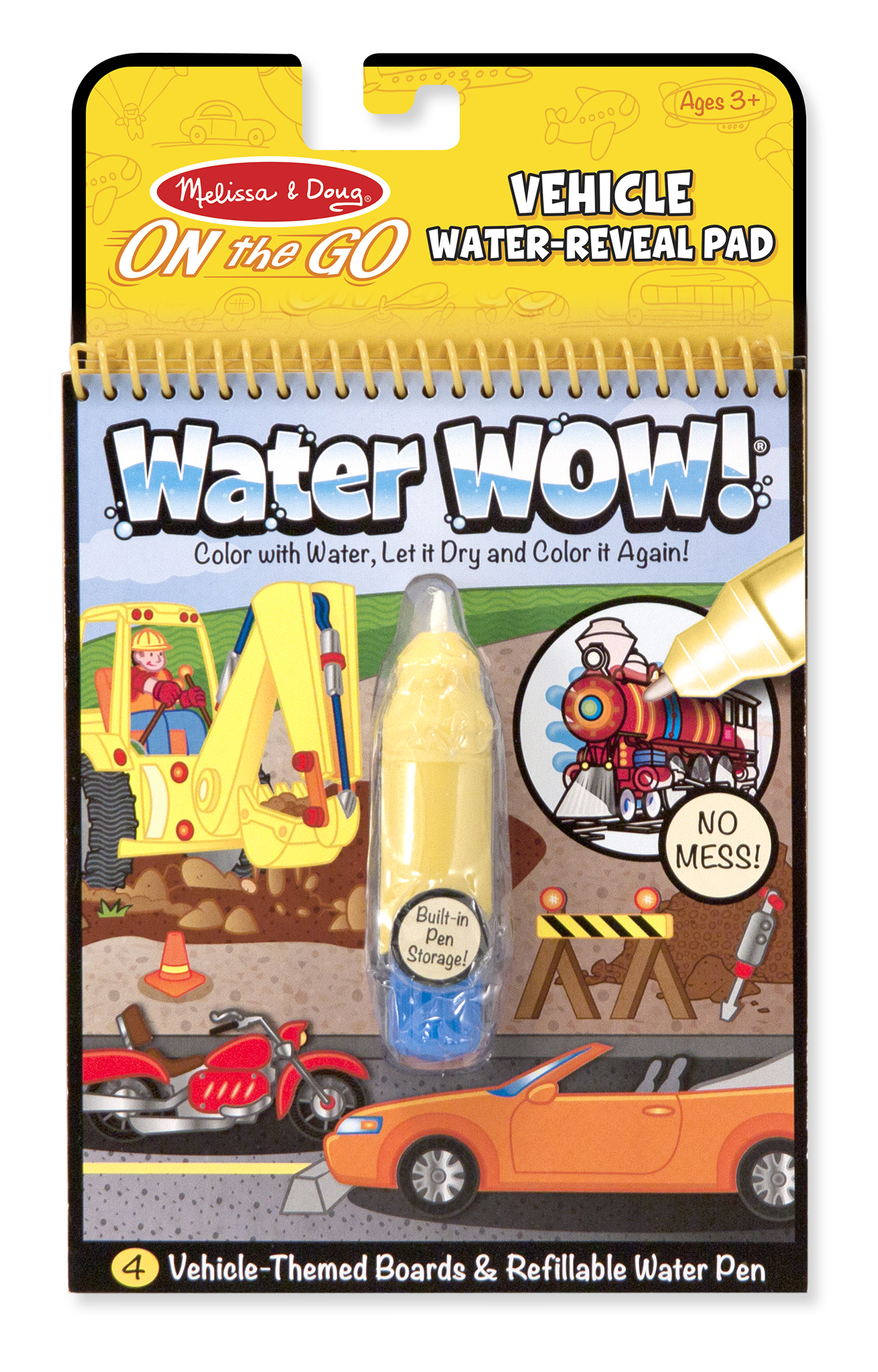 Melissa and Doug Water Wow! Vehicles 5375 New No-mess painting for kids! This exciting paint-with-water coloring book includes four reusable pages and a refillable water pen. Simply use the pen to color in each scene - details and vibrant color appear with every stroke! Then let the page dry to erase the pictures and fill it in again and again. This vehicle-themed book includes four scenes to color, and a search-and-find activity for each scene. The chunky-sized water pen is easy for kids to hold and stores neatly right in the front cover, so Water Wow! books make ideal travel activity books and travel toys for kids. The Melissa & Doug traveling coloring books are designed to be both educational and entertaining.Specifications