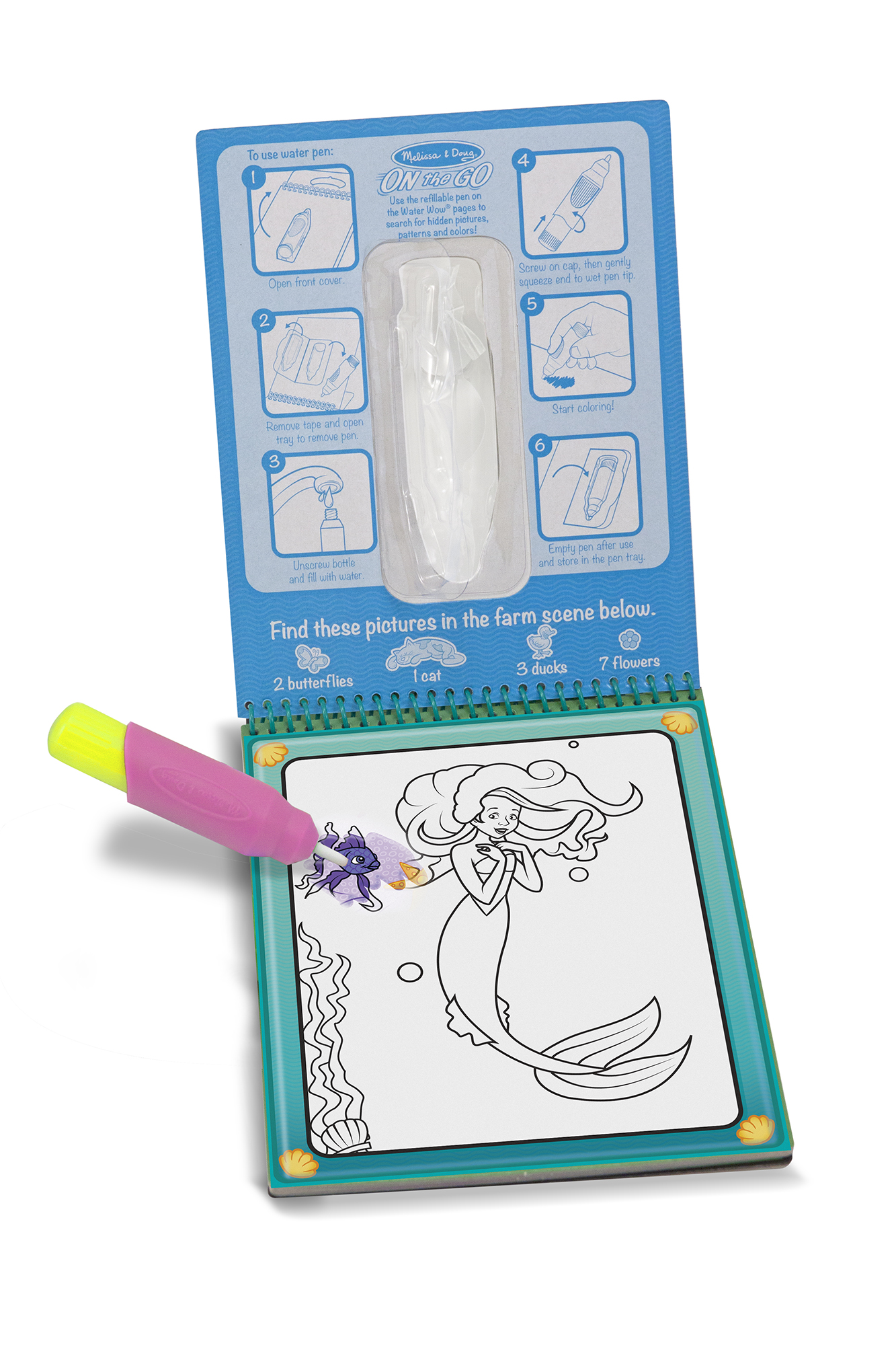 No-mess painting for kids! This exciting paint-with-water coloring book includes 4 reusable pages and a refillable water pen. Simply use the pen to color in each scene details and vibrant color appear with every stroke! Then let the page dry to erase the pictures, and color it in again and again. This fairytale-themed book includes 4 scenes to color in, along with a search-and-find activity for each scene. The chunky water pen is easy for kids to hold and stores neatly right in the front cover, making the On the Go Water Wow! an ideal travel activity book and travel toy for kids. This water-painting activity set for kids is packaged in a convenient spiral notebook. The Melissa & Doug On the Go Water Wow! Fairy Tale Reusable Water-Reveal Activity Pad make a delightful and educational gift for kids from 3 to 6 years. Add a Melissa & Doug Reusable Sticker Pad to round out the hands-on play experience and give kids another engaging option for screen-free entertainment. For more than 30 years, Melissa & Doug has created beautifully designed imagination- and creativity-sparking products that NBC News calls "the gold standard in early childhood play." We design every toy to the highest quality standards, and to nurture minds and hearts.Specifications