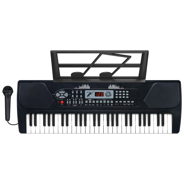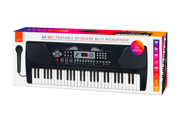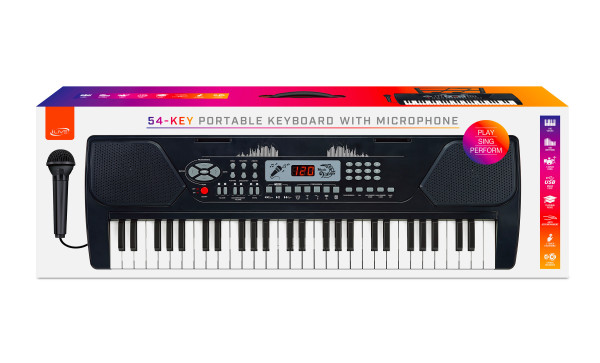 Create a new masterpiece with this 54 key keyboard and microphone. If you are a beginner no worries! This keyboard comes equipped with a teaching mode to help guide you along the way. Use the percussion sound effects while the recording function allows you to create and playback your musical masterpiece. 54-key portable keyboard. 100 voice timbres. 100 rhythms. 5 drum pads. USB port. Teaching modes. Auto accompaniment. Song recorder. 2-way stereo speakers. 4 modes: Record Playback Demo Play. Music stand and Red LED display. DC power input: requires an AC/DC power adapter included. DC battery power: requires 6 AA batteries. AC/DC power adapter.Specifications