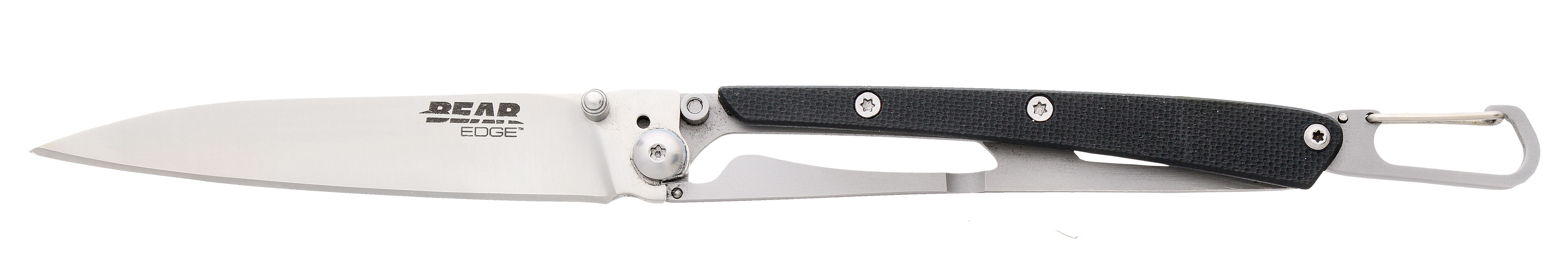 The Bear & Son Bear Edge Minimal Framelock Medium features a 2.5" 440 stainless steel drop point blade with a satin finish and a blade thickness of .10". It's a manual folder with a thumb stud. This framelock has black G-10 handles with a polished stainless steel liner and a folding carabiner clip. It's 3.25" closed, 5.75" overall, and weighs .8oz.Specifications