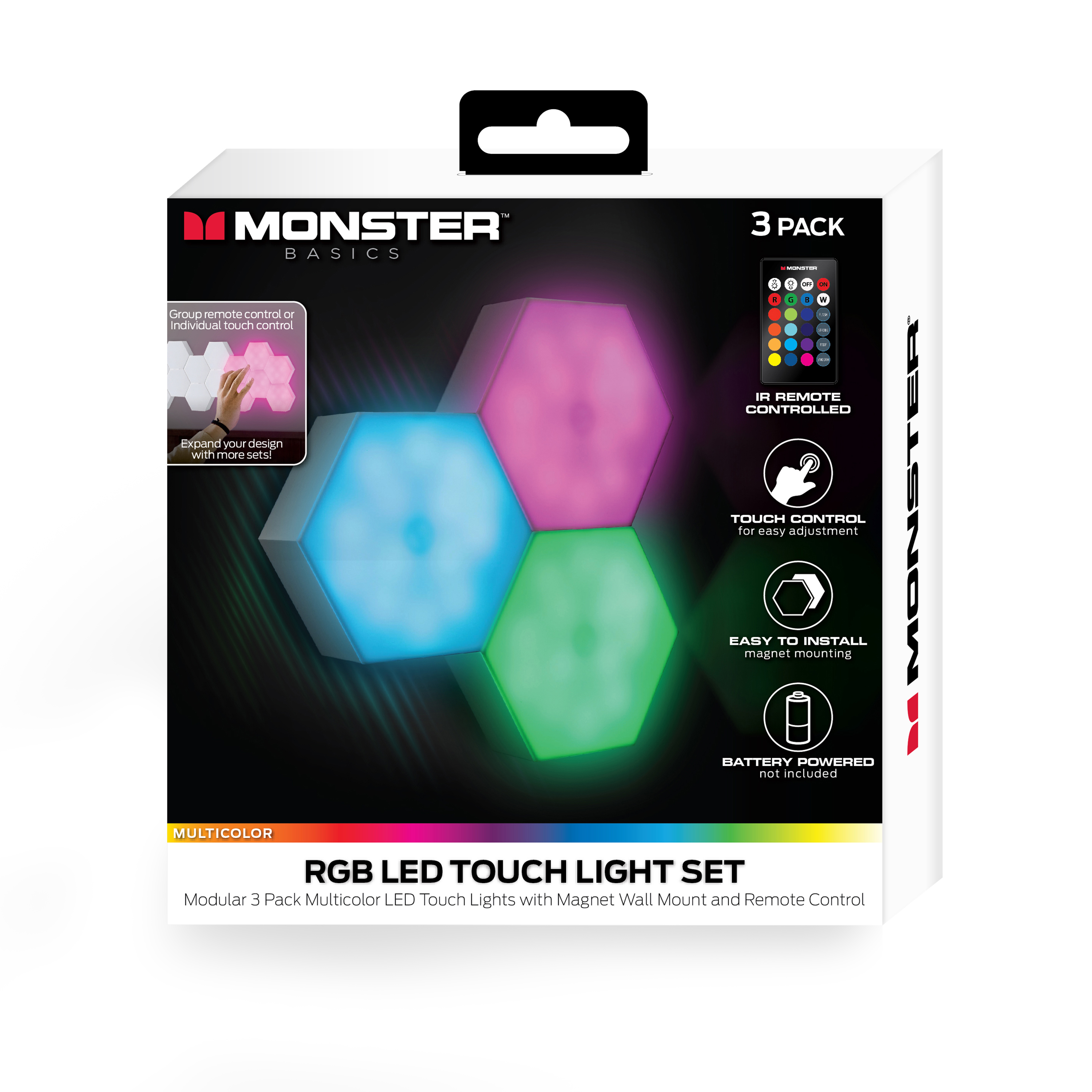 Do you want to add a little extra color to any room and make your space stand out? With the Monster Multi-Color LED Touch Light, you’ll be able to redefine what lighting is. Perfect for living rooms, bedrooms, next to bookshelves or even your home office, the Touch Light compliments any location. Featuring four color-changing modes and a variety of colorful shades, you can craft the right combination to match your environment or your mood. You can craft unique patterns that place your lights together or make them into whatever patterns suits your space or make you happy. You’ll have two ways to control your LED Lights, use the touch control feature to select your colors and changing modes, or use the included remote control for the desired combinations from up to 26 feet away. Installation’s a breeze, just peel off the back cover and the magnet sticks the light to any surface. All three are powered by three AAA batteries and you can purchase more lights to create even more striking and customized patterns. Make your space stand out in the best way with the Multi-Color LED Touch Light 3-Pack today.Specifications