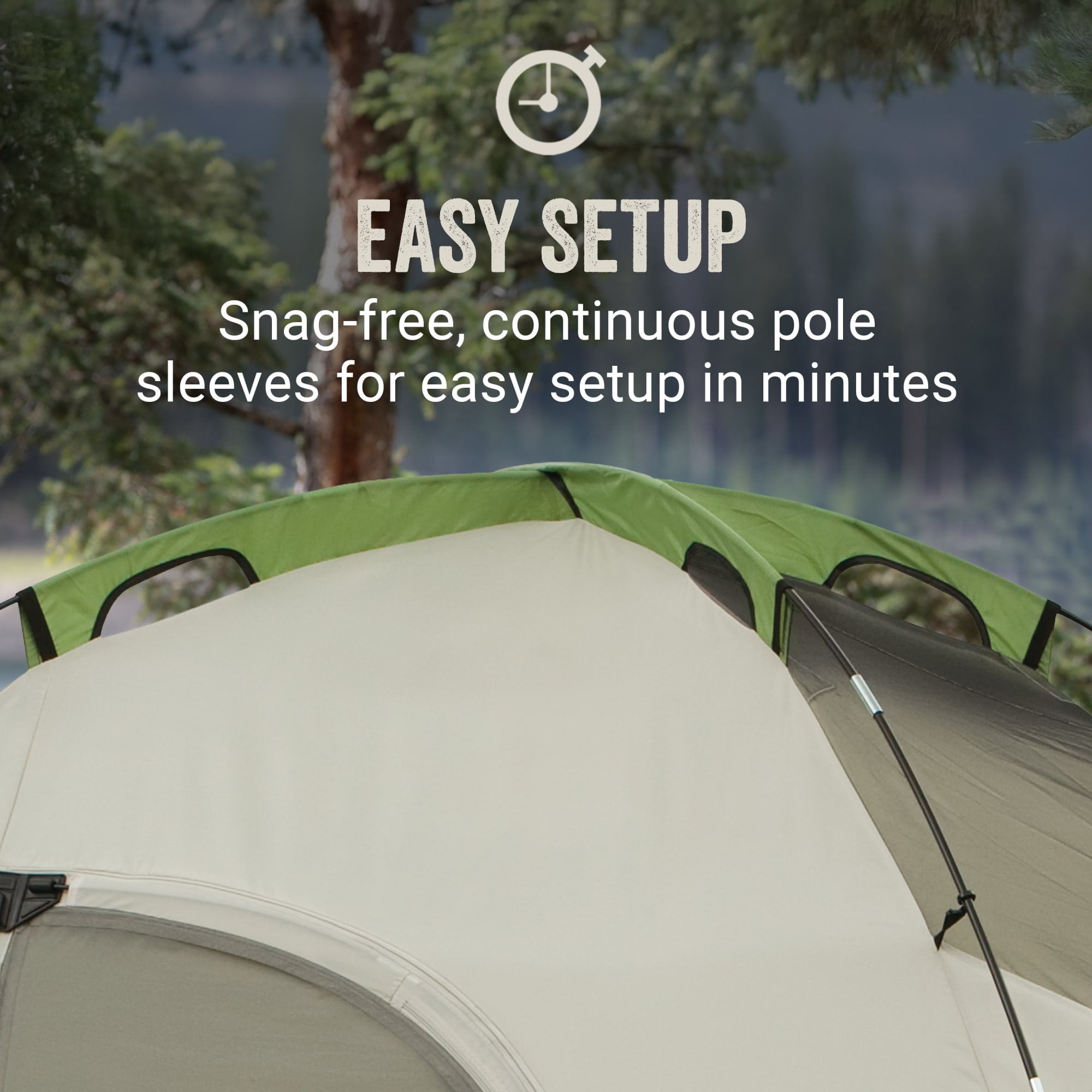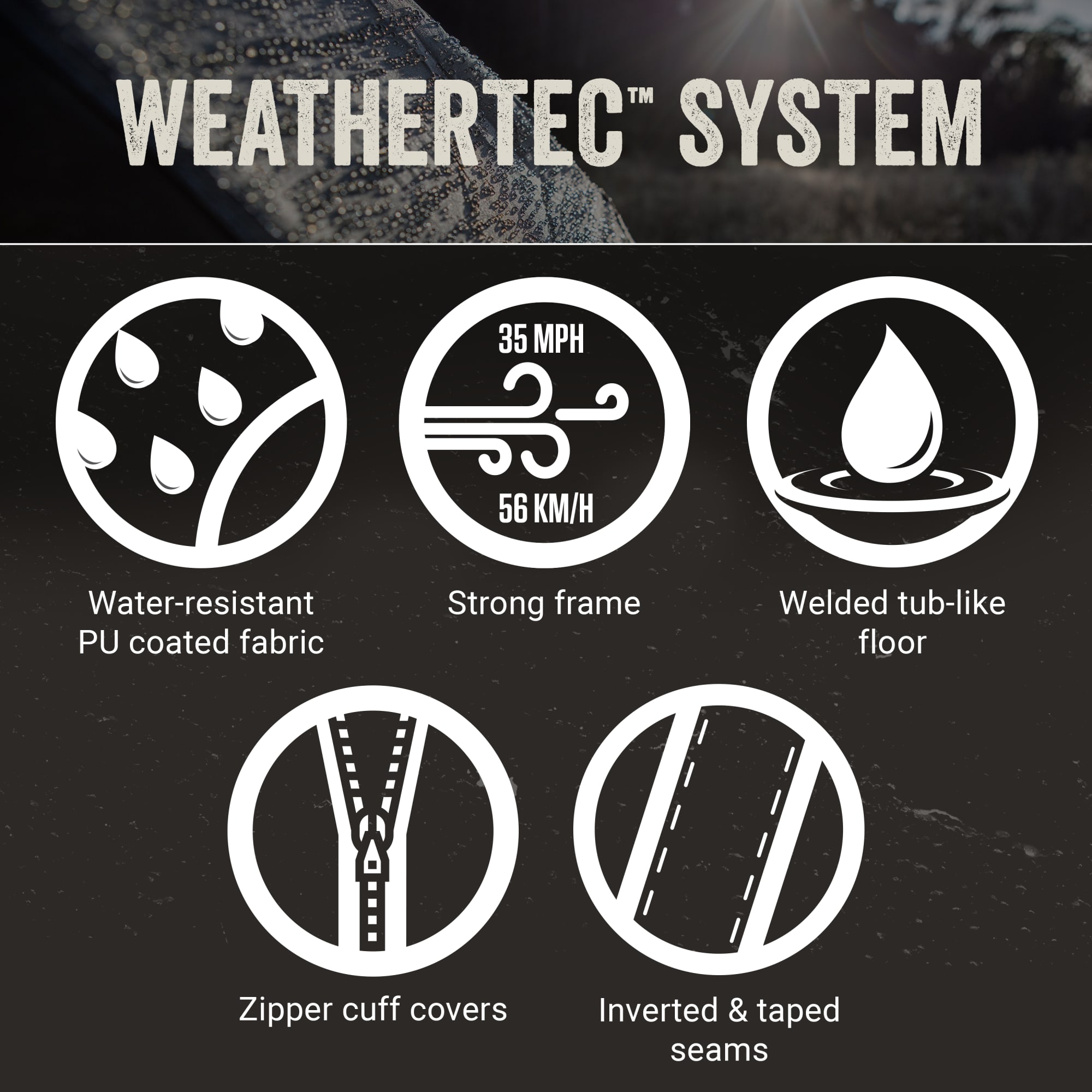 Angled windows; Durable Polyguard Fabric; E-Port makes it easy to bring electrical power inside your tent; Included rainfly; Pocket Storage; WeatherTec system patented welded floors and inverted seams help keep water out