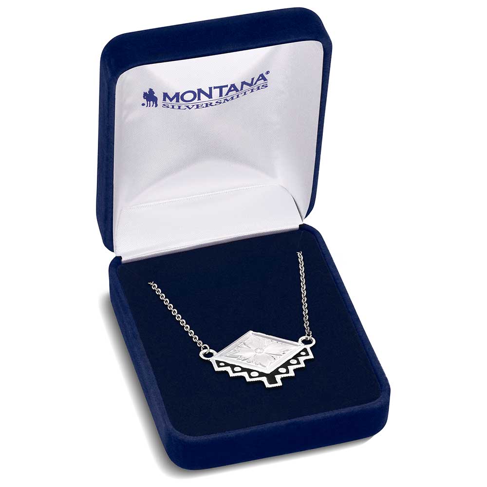 A black step design creates the bottom edge of the pendant; Darling of the West; Features a unique diamond shape with silver tone engraved floral within; Montana Armor to prevent tarnish; Necklace; Necklace has an 18.5 inch adjustable chain; Silver plating over a Brass base