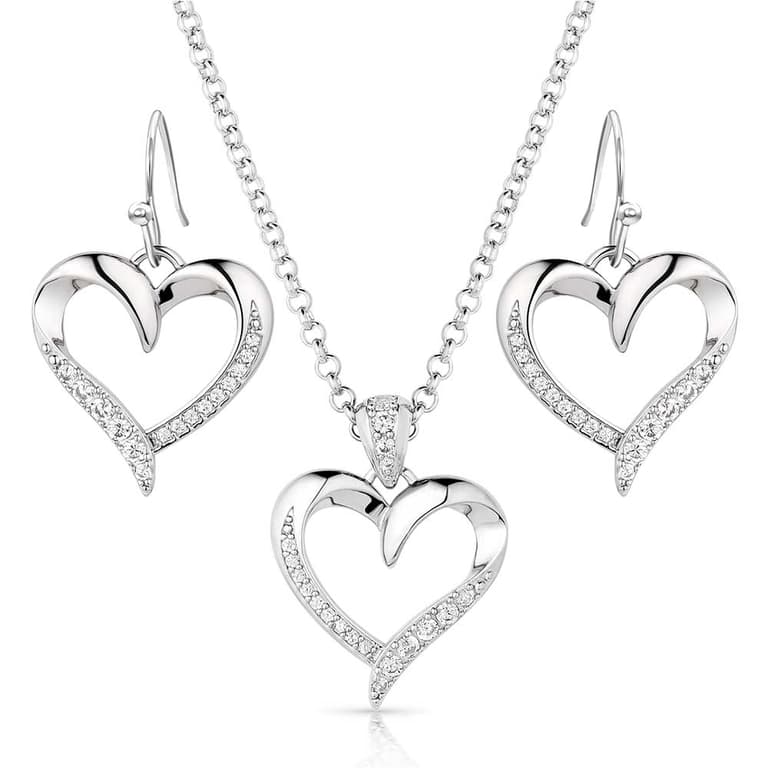 Bottom half of the heart is studded in clear cubic zirconia crystals; Cubic Zirconia; Divine Affection Jewelry Set; Earrings have hypoallergenic French wires; Earrings in this set match the necklace design; Montana Armor to prevent tarnish; Necklace features a silver tone open heart design; Necklace has a 19 inch adjustable Rolo chain; Rhodium plating over a Brass base; Simple yet elegant design