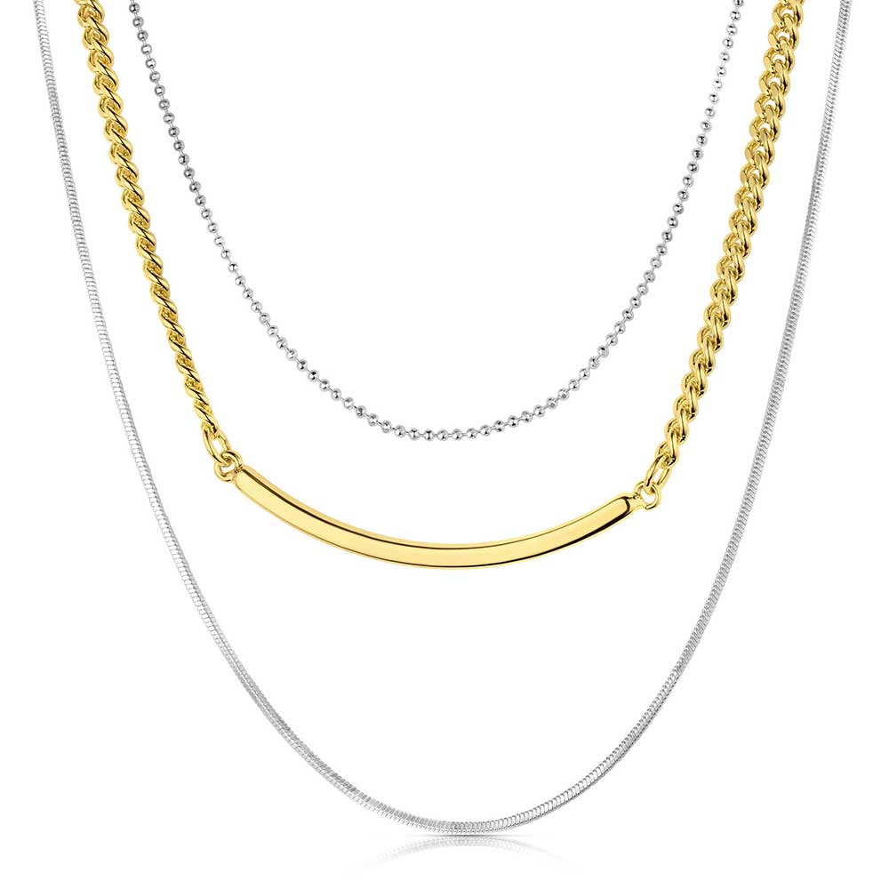The Effortless Layered Necklace features three distinct strands that come together at the clasp for a sophisticated layered look. One strand is composed of small silver toned berries, while the middle strand offers a sleek gold toned link chain that transitions into a smooth bar. The longest strand is a classic silver toned chain, creating a harmonious blend of textures and tones for a timeless and elegant accessory. Necklace is 21 inches long and adjustable.Specifications