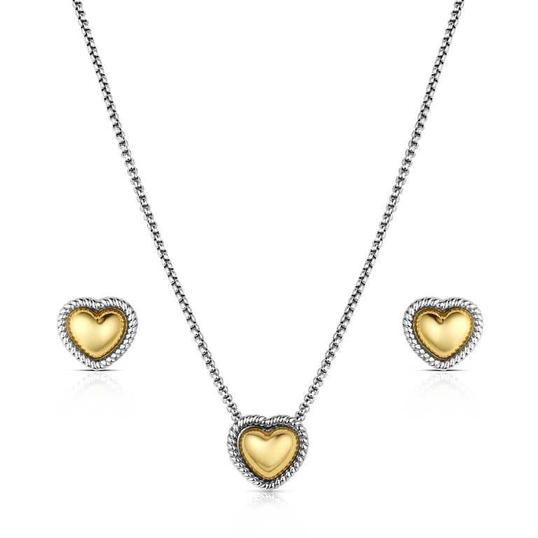 The Trio of Hearts Jewelry Set is a charming two tone set crafted in silver and gold tones. The necklace features a 20 inch adjustable cable chain, while both pieces showcase a delicate heart motif. Balancing timeless elegance with versatile style, this set adds a subtle, polished touch to everyday outfits, special occasions, or layered looks.Specifications
