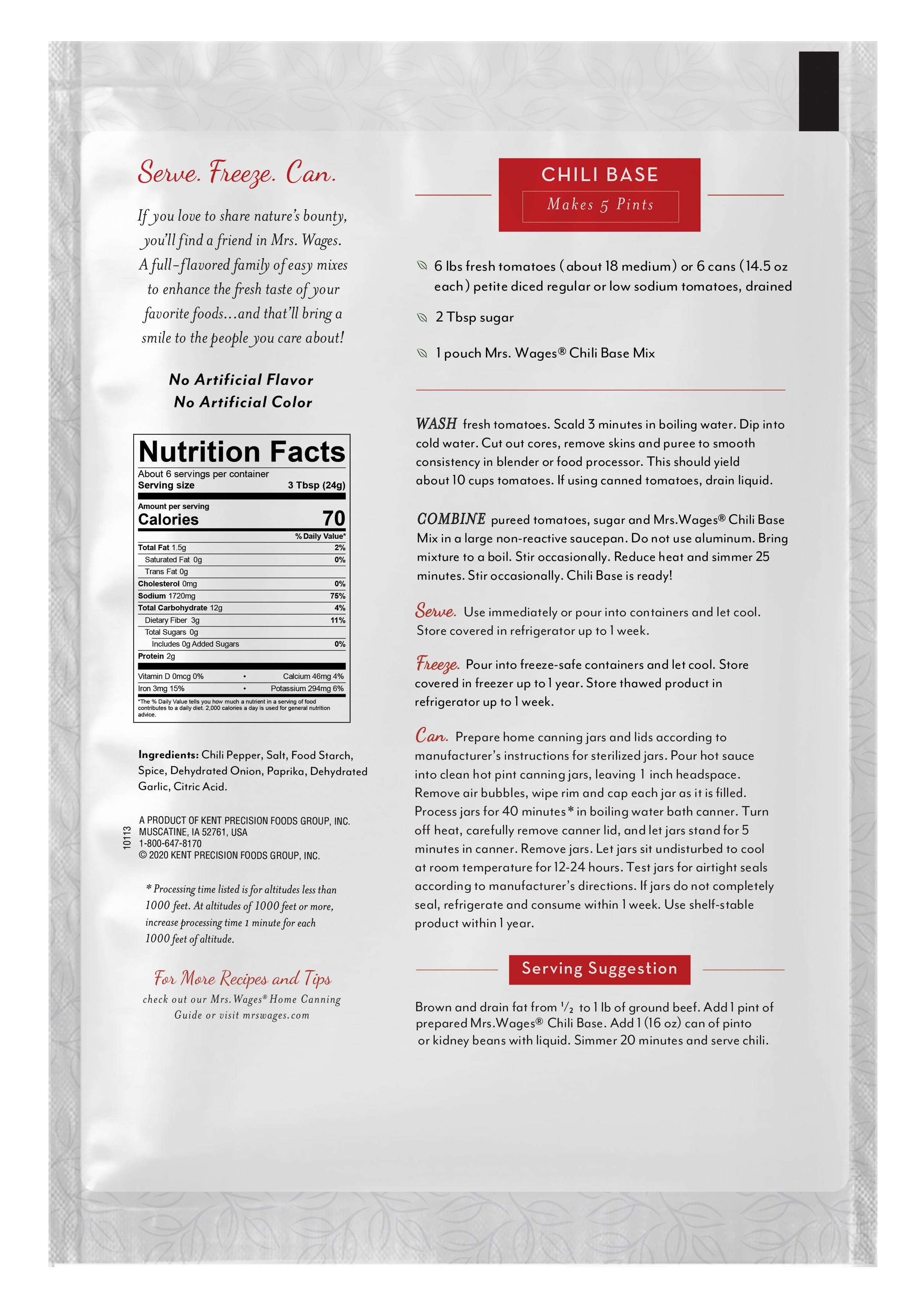 Interested in making homemade meals from fresh or canned tomatoes? Wondering what to do with your abundance of garden tomatoes? Create your own chili with Mrs. Wages! You can use this mix to create chili or to add spice to just about anything! Each pouch makes 5 pints.Specifications