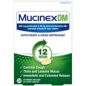 Mucinex DM expectorant and cough suppressant helps to loosen phlegm and to get rid of bothersome mucus or cough. Cough suppressant has unique bi-layer which starts working right away and effects immediately for early relief. Thins and loosens mucus and helps controls cough.Specifications