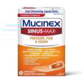 Mucinex Sinus Max Severe Congestion Relief Liquidgels.When nasal congestion or sinus pressure build, it can feel like a ton of bricks have landed on your head. However, many Mucinex Sinus-Max products are designed to help clear up your stuffy nose, relieve headaches and thin and loosen excess mucus. Get the answers to common questions about sinus pressure and nasal congestion below, and find the right Mucinex Sinus-Max product to provide the sinus pressure and nasal congestion relief that you need to feel better.Specifications