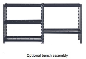 1000 LBS PER SHELF; 48" X 24" X 72"; 5 SHELVES; ADJUSTABLE SHELF LEVELS at 1 1/2 " INCREMENTS; BLACK POWDER COAT FINISH; NSF FOR STORAGE OF DRY FOODS; OPTIONAL BENCH ASSEMBLY