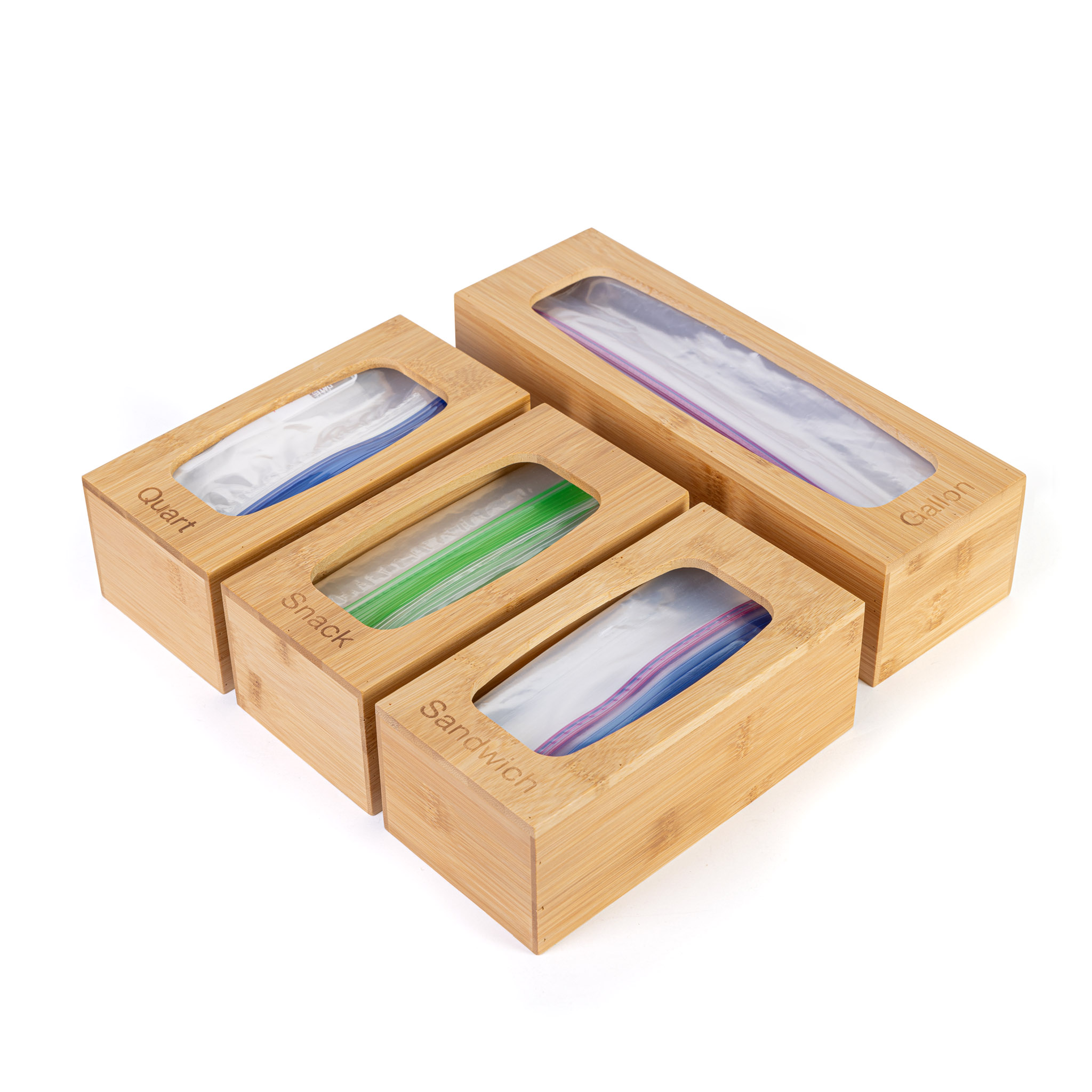 Organize your storage bags with our Set of 4 Bamboo Storage Bag Organizers. Eco-friendly bamboo enhances your kitchen decor and is easy to cleanjust wipe it with a damp cloth.Package Includes Set of 4 Bamboo Storage Bag Organizers Fits most standard-size drawers; measure shelf dimensions for proper fit. Ideal for keeping storage bags organized.Features and Benefits Our Set of 4 Bamboo Storage Bag Organizers are crafted from durable and eco-friendly bamboo. This design features laser engraved labels and easy dispensing openings to keep all your storage bags organized. Product Specifications Dimensions: Gallon 11.8 (W) x 4 (D) x 3 (H); QuartSnackSandwich 7.8 (W) x 4 (D) x 3 (H)Design: Set of 4 Bamboo Storage Bag OrganizersColor: Natural Material: BambooSpecifications