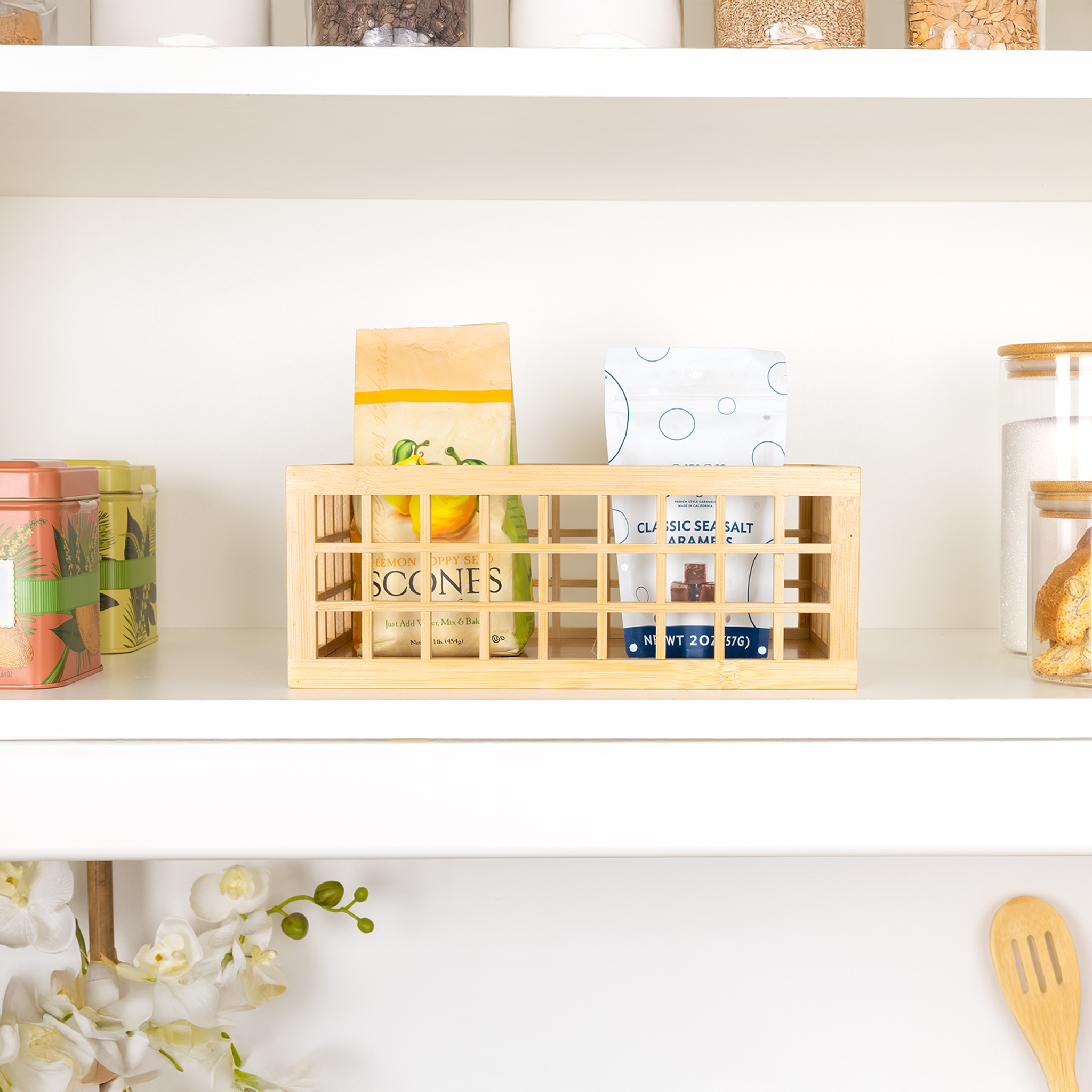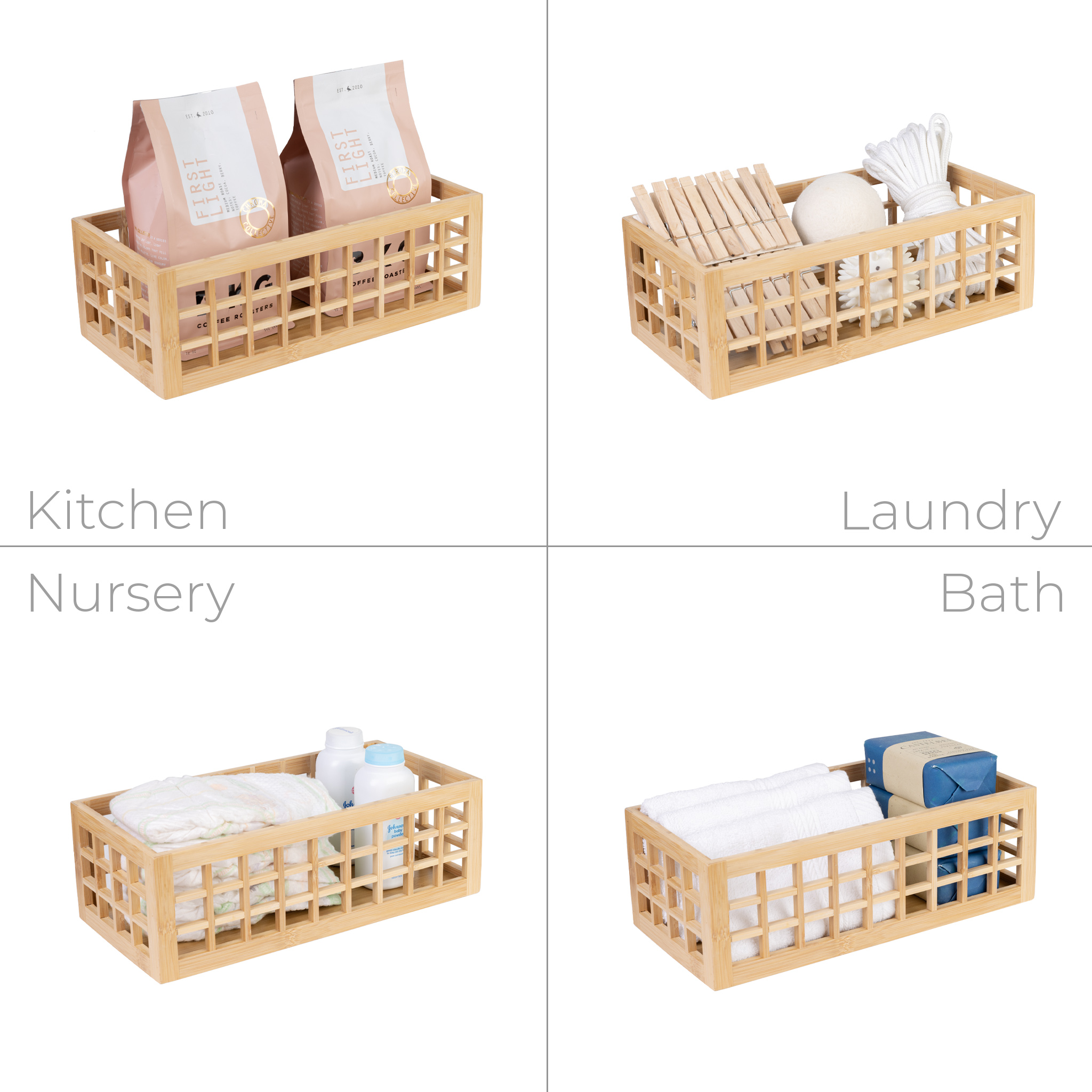 Organize your home with our Bamboo Storage Bin. Eco-friendly bamboo enhances your kitchen decor and is easy to cleanjust wipe it with a damp cloth.Package Includes Bamboo Storage Bin Ideal for elevating your home decor.Features and Benefits Our Bamboo Storage Bin is crafted from durable and eco-friendly bamboo. This design features a crate-inspired design for easy visibility of all the contents. Product Specifications Dimensions: 12 (W) x 6 (D) x 4 (H) inches Design: Bamboo Storage BinColor: Natural Material: BambooSpecifications