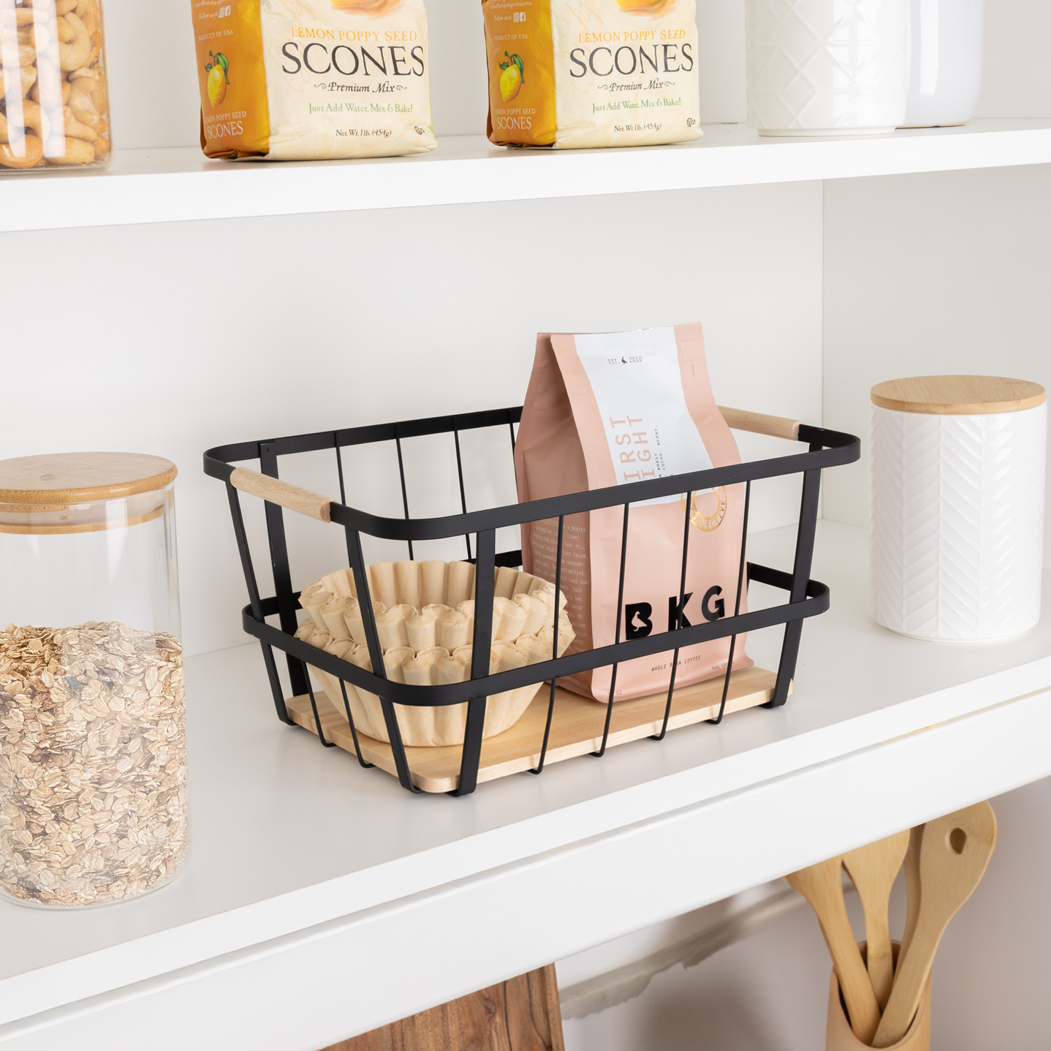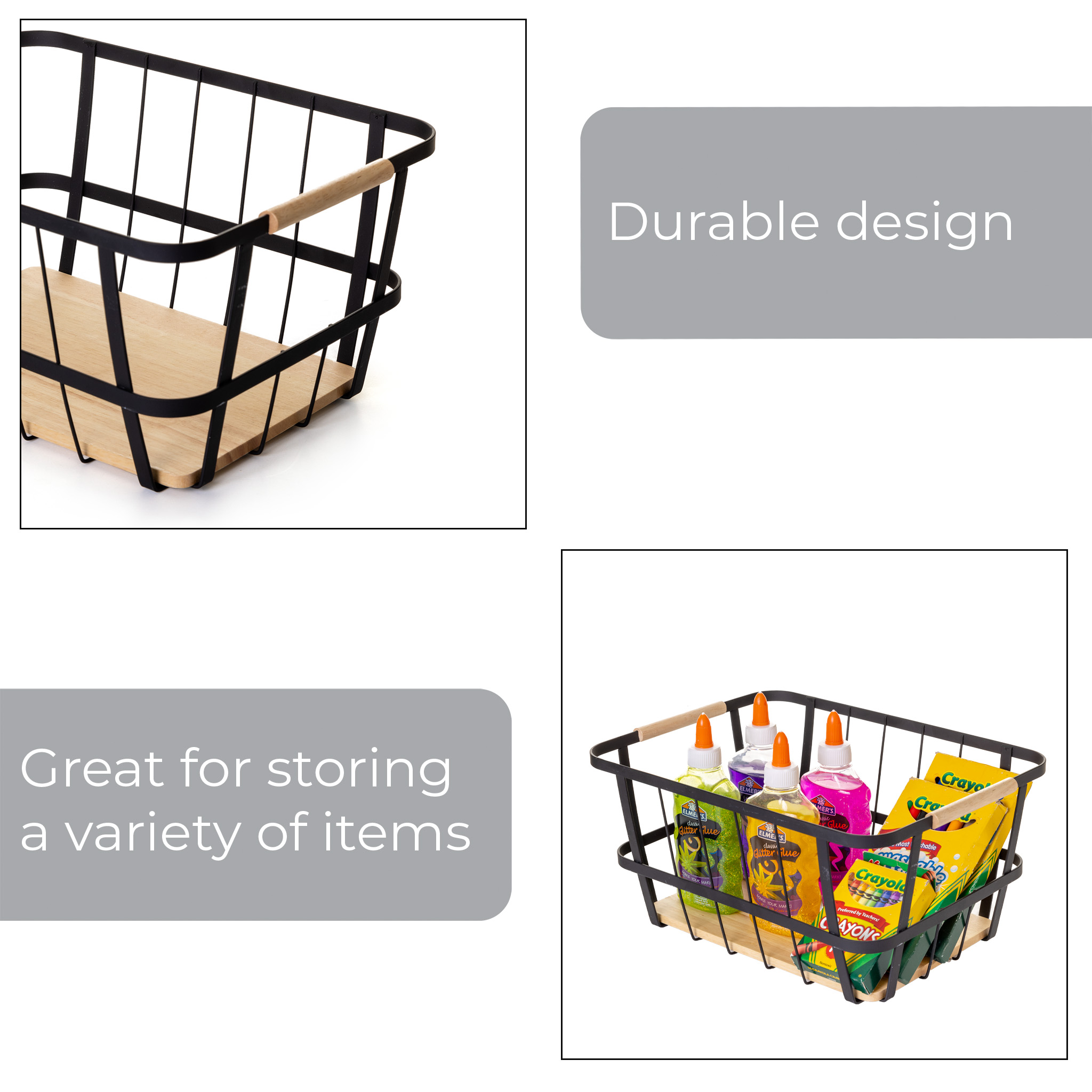 Organize your kitchen with our Large Wire Basket with Wood Accents. Sturdy steel and eco-friendly rubberwood accents elevate your home decor.Package Includes Large Wire Basket with Wood AccentsIdeal for the kitchen, bathroom, living room, and more.Features and Benefits Our Large Wire Basket with Wood Accents is crafted from sturdy steel metal and eco-friendly rubberwood. The steel wire features rust-proof technology, and the rubberwood handle ensures a comfortable grip.Product Specifications Dimensions: 12 (W) x 9 (D) x 6 (H) inches Design: Large Wire Basket with Wood Accents Color: Black, Natural Material: Steel and RubberwoodSpecifications
