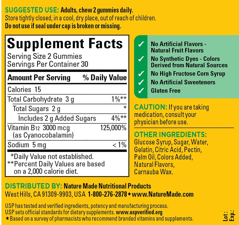 Get an extra strength dose of Vitamin B12 in two delicious gummies. B12 is an important B vitamin that supports brain cell function, the production of neurotransmitters needed for mood health, and cellular energy production. With 3000 mcg per serving, these B12 gummies also help reduce fatigue for those low in B12.Nature Made Extra Strength Vitamin B12 provides 3000 mcg of this important B vitamin in two delicious gummies to support brain cell function and neurotransmitter production important to mood health, and help convert food into cellular energy. This extra strength supplement helps reduce fatigue for those low in B12 and may be important to vegetarians and vegans who may not consume enough of this essential nutrient from diet alone.Supports brain cell functionHelps reduce fatigue for those low in Vitamin B12Two daily gummiesDelicious Cherry & Mixed Berry with other natural flavorsNo synthetic dyes, no artificial flavors, no artificial sweeteners, no high fructose corn syrup, gluten-free #1 Pharmacist Recommended Vitamin & Supplement BrandSpecifications