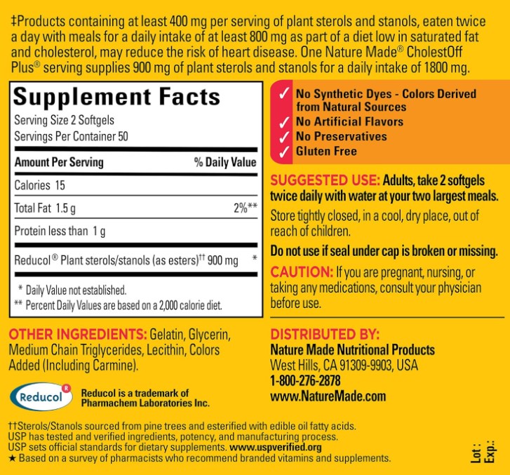Potent Formula: Cholest-Off Plus contains 900 mg of plant sterols and stanols per servingConvenient Dosage: This value-sized bottle contains 100 softgels, providing a 50 day supplyEasy to Swallow: The softgel capsules are designed for easy consumption and better absorption.Made from carefully selected ingredients under strict manufacturing processesNo synthetic dyes, no artificial flavors, no preservativesNature Made CholestOff Plus is a dietary supplement that helps support a healthy heart and lowers dietary cholesterol (1). it lowers cholesterol by reducing the absorption of dietary cholesterol into the bloodstream (1). Adults, take two of these lower cholesterol supplements twice daily with water at your two largest meals for a total of 1800 mg of plant sterols and stanols (2) per day to lower dietary cholesterol. Nature Made supplements are quality you can trust. USP has tested and verified ingredients, potency and manufacturing process. USP sets official standards for dietary supplements. Visit the USP verified website for more information. (1)Products containing at least 400 mg per serving of plant sterols and stanols, eaten twice a day with meals for a daily intake of at least 800 mg as part of a diet low in saturated fat and cholesterol. One serving of Nature Made CholestOff Plus supplies 900mg of plant sterols and stanols for a daily intake of 1800mg. (2)Sterols/stanols sourced from pine trees and esterified with edible oil fatty acids. Based on a survey of pharmacists who recommend branded vitamins and supplements. it is a trademark of Pharmachem Laboratories Inc.Specifications