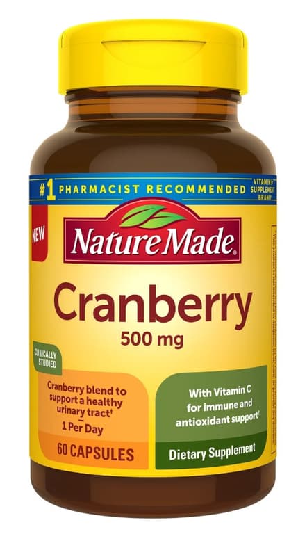 Nature Made Cranberry Capsules 500mg with Vitamin C provide a clinically studied Cranberry blend to support a healthy urinary tract. These Cranberry pills also provide 90mg Vitamin C for antioxidant support and immune system support. Adults, take 1 capsule daily with water and a meal. These Cranberry pills for women and men are sugar free (1) and gluten free with no added preservatives, no synthetic dyes and no artificial flavors. Start your day with a Cranberry supplement from Nature Made. (1)Not for weight control; Cranberry fruit powder blend adds a trivial amount of sugar. Based on a 2022 survey of pharmacists who recommend branded vitamins and supplements. These statements have not been evaluated by the Food and Drug Administration. This product is not intended to diagnose, treat, cure or prevent any disease.Specifications