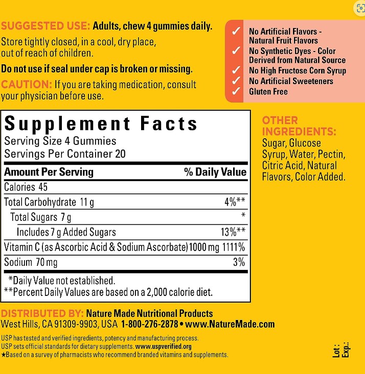 Nature Made Vitamin C 1000mg per serving Gummies are a delicious, tangerine-flavored immune system supplement that provides a maximum strength dosageTo support the immune system and a healthy upper respiratory tract. Vitamin C is an antioxidant that helps with Iron absorption and is necessary for the body to produce Collagen, which helps support skin health. Made from carefully selected ingredients under strict manufacturing processes, these pectin-based Vit C 1000mg per serving gummies are gluten free and have no artificial flavors, no high fructose corn syrup, no artificial sweeteners, and no synthetic dyes, color derived from natural source. Adults chew four gummies daily. Start your day with Nature Made Vitamin C Gummies for adults. USP has tested and verified ingredients, potency and manufacturing process. USP sets official standards for dietary supplements. Visit the USP verified website for more information.Immune support supplement: contains one 80 count bottle of Nature Made Vitamin C Maximum Strength Dosage. Gummies for a 20-day supplyThese Vitamin C gummies help support the immune system and a healthy upper respiratory tractVitamin C is an antioxidant that increases Iron absorption and is needed for Collagen synthesis to support skin healthMaximum Strength dosage with Vitamin C 1000mg per servingAdults chew 4 Tangerine flavored gummies dailyThis pectin-based Vitamin C supplement is gluten free with no artificial flavors, no synthetic dyes, no high fructose corn syrup, no artificial sweetenersSpecifications