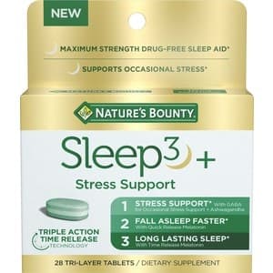 Wake up feeling refreshed with Nature’s Bounty Sleep3+ Stress Support! The First and Only Maximum Strength Tri Layer Sleep+ Stress aid is a triple action supplement that provides support for occasional stress and promotes sound sleep. Using innovative time-release technology, each layer is dissolved at different times throughout the night to help you relax, de-stress, and get long-lasting sleep. Melatonin, a key ingredient in this innovative formula, plays a vital role in the maintenance of circadian rhythm sleep-wake-cycle, sleep induction, and sleep duration plus its perfect for those experiencing occasional sleeplessness. Sleep3+ Stress Support contains 10 mg of melatonin per serving including both quick release melatonin to help you fall asleep fast, and time-release melatonin that works with your body’s natural sleep cycle to help you stay asleep longer while supporting quality restful sleep. For added stress-relief benefits, Nature’s Bounty Sleep3+ Stress Support also includes 100 mg of GABA to help relax the mind and support occasional stress, plus 60g of Ashwagandha per serving.Specifications