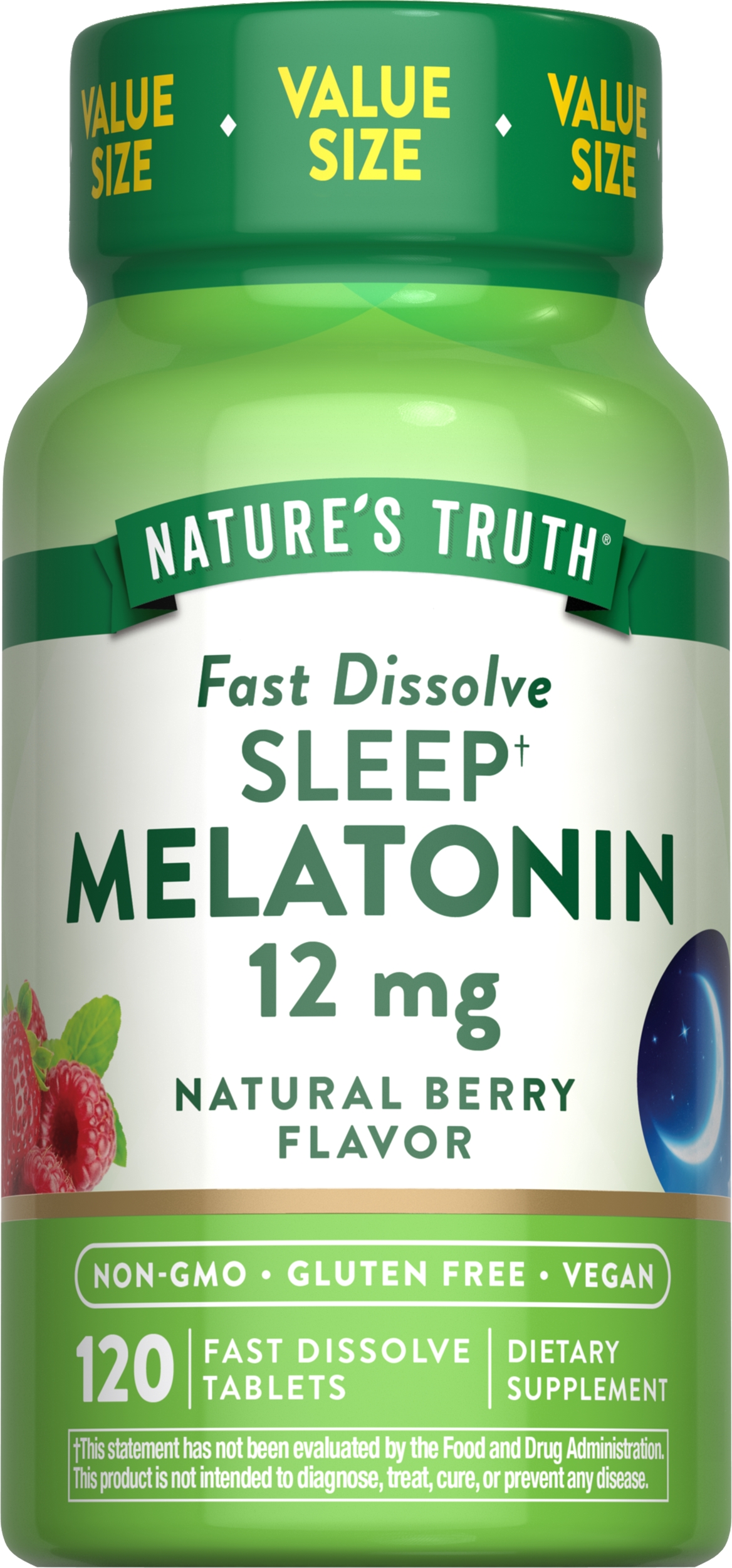 Dairy Free; Extra strength Melatonin provides you with 12 mg of this beneficial nighttime sleep aid per serving; Fast Dissolve Melationin 12mg Berry; Gluten Free; Melatonin plays an important role in our sleep cycle and can help with the occasional sleeplessness; Non-GMO; Vegetarian