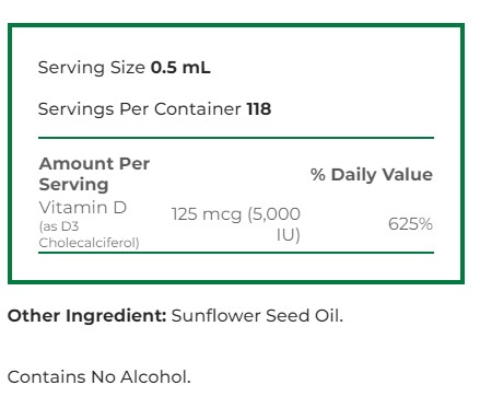 Bring your own sunshine to each day with Nature’s Truth Liquid Vitamin D3! Known as the "sunshine vitamin" because of the body’s ability to produce it naturally after sunlight exposure, Vitamin D is a staple in your wellness routine.Vitamin D3 is important for your health as it aids in the absorption of calcium, helping to keep your bones strong. While sunlight can trigger your body to naturally create Vitamin D3, it’s not always practical to rely on the sun alone. This convenient liquid form of Vitamin D3 from Nature’s Truth can be taken directly from the dropper or mixed in with your favorite beverage to ensure you are receiving your daily dose of essential vitamin D3. You can leave your sunscreen on, after all!The rate of absorption from a liquid vitamin tends to be quicker than other delivery forms, allowing your body to feel the benefits quicker. The easily digestible liquid vitamin is also super convenient for those who dislike swallowing capsules and tablets.Our mission at Nature’s Truth is to ensure your lifestyle is being met with products that go above and beyond. This vitamin is vegetarian friendly, Non-GMO, gluten free, wheat free, yeast free, milk free, lactose free, and soy free. Additionally, our Liquid Vitamin D3 is free of artificial flavor, artificial sweetener, and preservatives. We do our very best to deliver only the best quality ingredients when it comes to our vitamins and supplements.Specifications