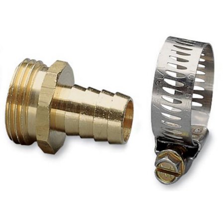 Machined brass coupling and stem; Male; Repairs 3/4 garden hoses.; Stainless steel hose clamp