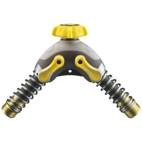 Dual outlet; Extra large soft plastic easy grip flow control knob; High-flow design for 45% higher water flow rate; Large on/off knobs with soft grip overmold; Metal easy swivel coupling with ergonomic grip; Rezimar body flexible hose with kink-free coil; Rezimar body with metal ergo swivel coupling