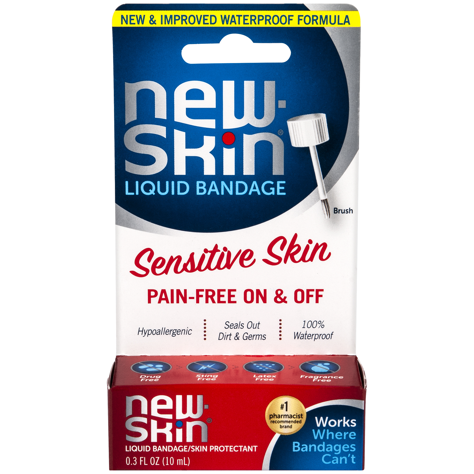 New-Skin Sensitive Skin-designed for easily irritated skin. It goes on sting-free and when you are ready to remove it, gently wash it off. No more painful removal of adhesive bandages. The unique hypoallergenic, waterproof, fragrance-free formula is created without alcohol or dyes to ensure it is gentle on the skin. New Skin creates a flexible, breathable shield that blocks out dirt and germs, helps protect from infection and heal cuts.Specifications