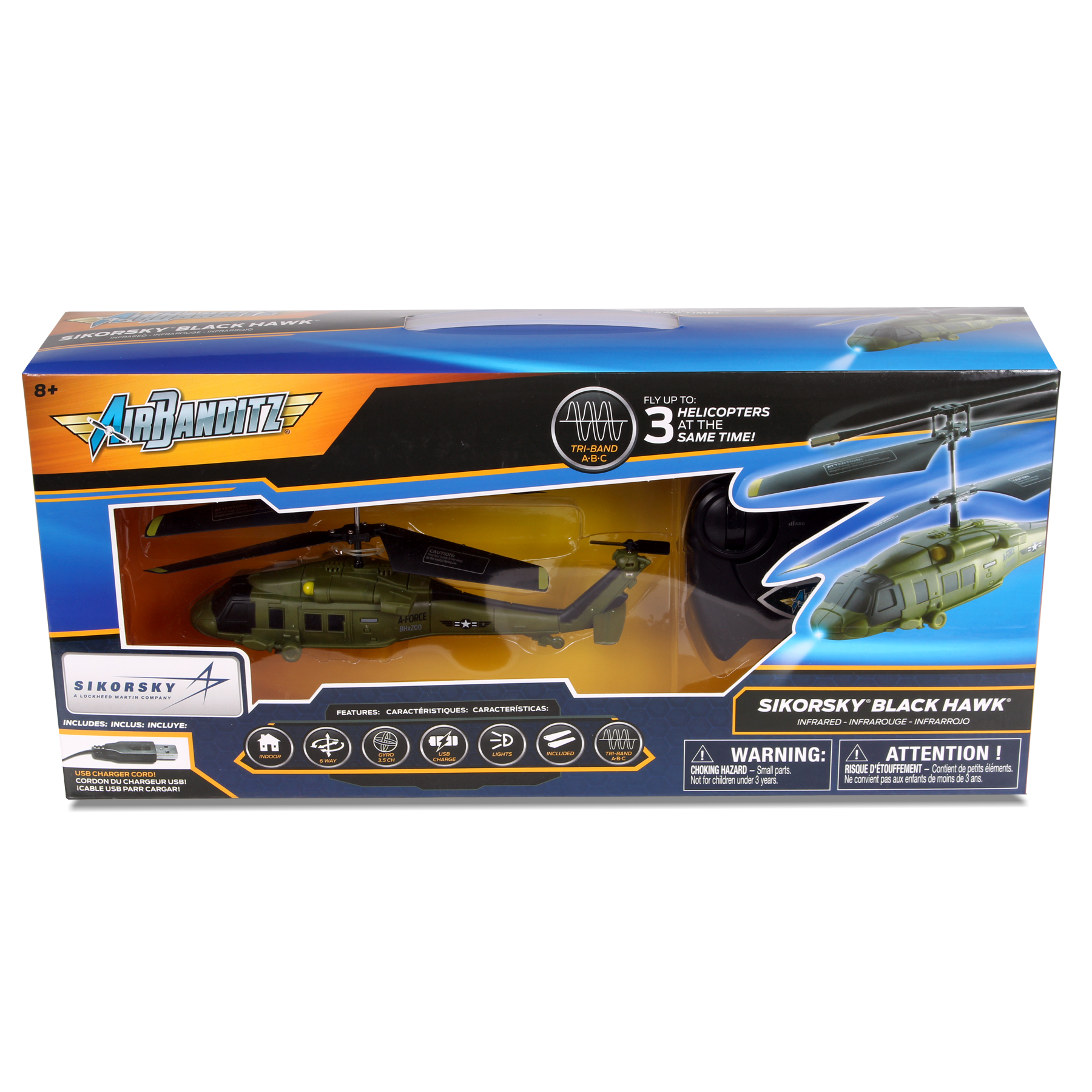 Air Bamditz with Gyroscope 2.4 GHZ IR/USB Sikorsky Black Hawk RC. The Sikorsky UH-60 Black Hawk has been cutting through the skies since 1974 and joined the US Army's aerial arsenal in 1979. It is still flown around the world by many countries. This remote controlled helicopter is much smaller than the full sized original, but it is still fun to fly. Officially licensed from Sikorsky!Specifications