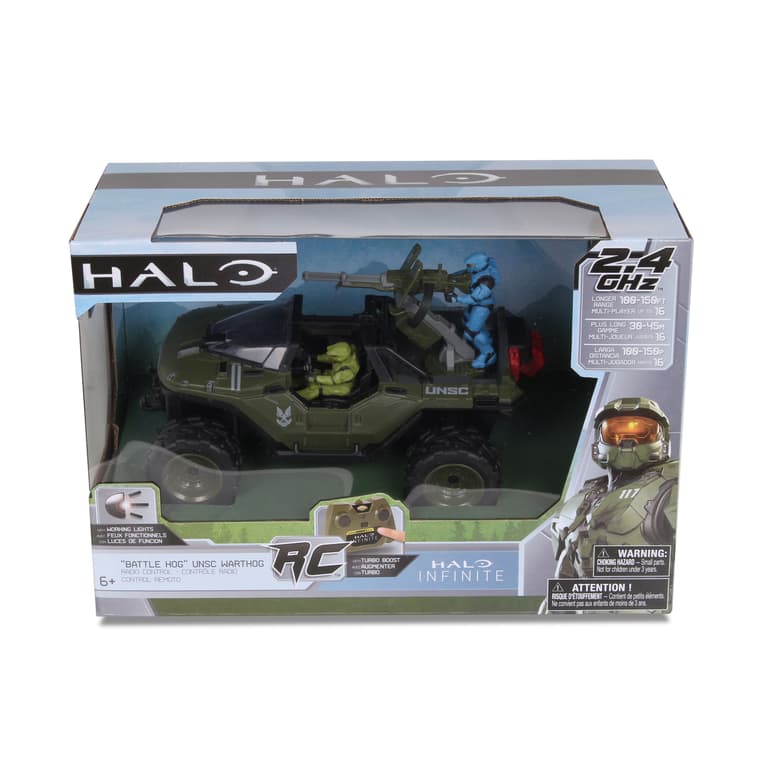 Halo Infinite is the sixth installment in the Halo series. It pays homage to all of the best elements from the previous games, and it features some of the most amazing futuristic military vehicles of all time. The iconic Warthog is an all terrain epochal beast that was a pivotal part of the original game (and basically every game ever since). This is the Battle Hog UNSC Warthog, a very special version of the Warthog. This primary joint light tactical ground vehicle is the most recognizable vehicle from the series, and it is now available in an RC version! This brand new radio controlled full function replica is intricately modeled after the original thing. It features the legendary UNSC Spartan Master Chief in the drivers seat, and a UNSC Spartan MKVII Cadet on the rotating turret in the back. The 2.4 GHz transmitter allows for unparalleled range and the ability to race/run up to 16 vehicles at the same time!The transmitter also features a functional turbo boost button! With one press, the Warthog goes from fast to super fast!Specifications