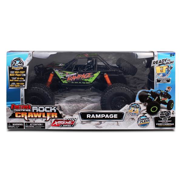 The brand new Ready To Run 2.4GHz 1/10 scale Rampage Rock Crawler with Action Camera Mount features an innovative suspension system that allows for unparalleled rock crawling abilities! The motors are incredibly powerful and the tires are insanely grippy, yet the proportions of chassis to body are natural and beautiful. With a super rugged body, this rock crawler is ready to climb! Features headlights and an action camera mount.Specifications