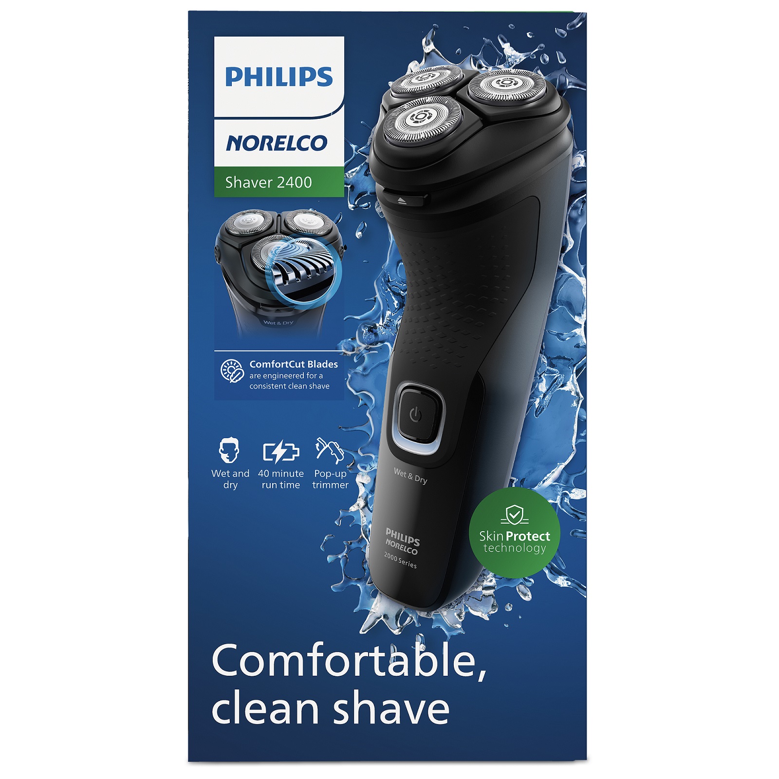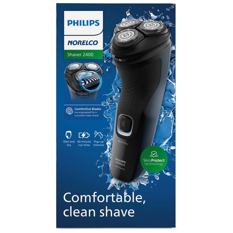 Philips Norelco Shaver 2400 Wet & Dry Electric Shaver gives you a comfortable, clean shave for wet and dry use. With 27 self-sharpening ComfortCut blades and a pop-up trimmer, it's fully washable for easy use and excellent value.Specifications
