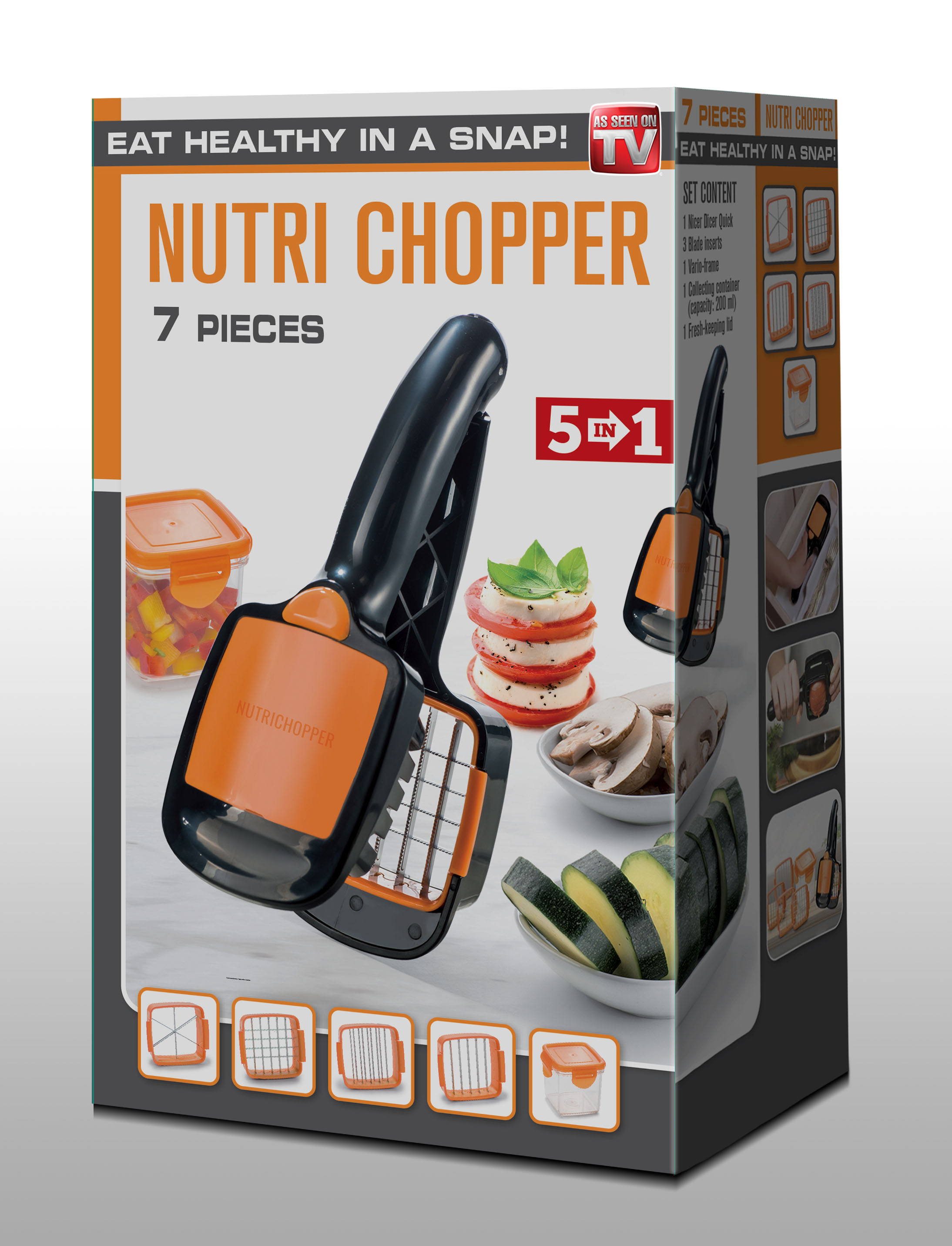 Nutri Chopper 5 in 1 Compact Handheld Kitchen Slicer - FINALLY, EAT HEALTHY IN A SNAP! Stop chopping vegetables one slice at a time with Nutri Chopper, the incredible, compact, handheld kitchen slicer that cuts your vegetables with just one snap! The engineers at Nutri Chopper have combined five different interchangeable slicing options into one super slicer, so now you can chop thick slices, thin slices, cubes and more! Nutri Chopper is ten times faster than your old knives, easier to use, and dishwasher safe! The quick-lock function lets you store Nutri Chopper in a drawer, safe and secure. Best of all, Nutri Chopper comes with a perfect portion container and fresh-keeping lid so you can precut foods to store or take with you!Specifications