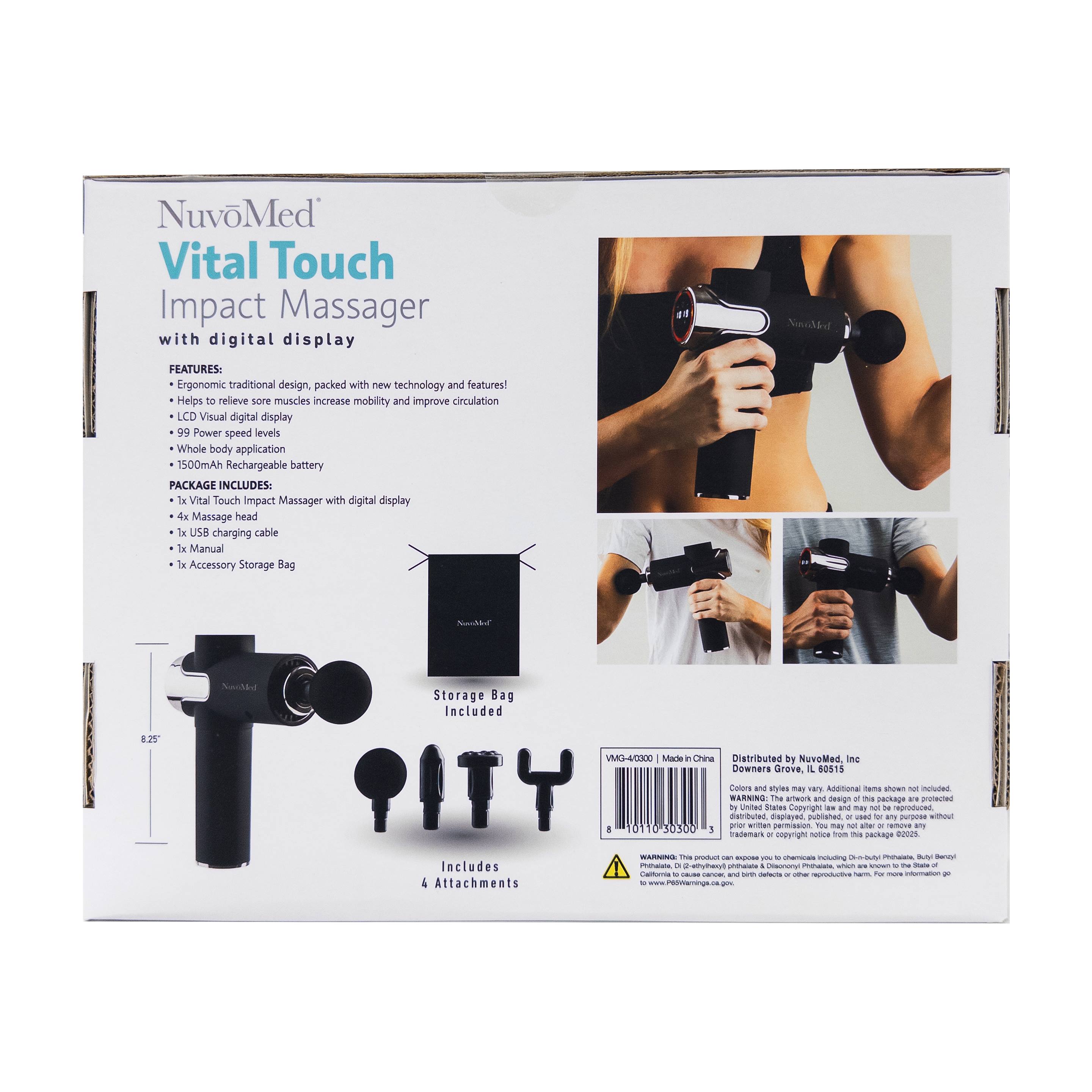 This vital touch impact massager has a digital display that shows the mode, speed, and battery power remaining. It has 4 interchangeable massage heads, 3 massage modes, and 99 speed settings! There is a rechargeable battery making it wasy to bring this massage gun with you on the go. It also comes with a storage pouch and USB charging cable.Specifications